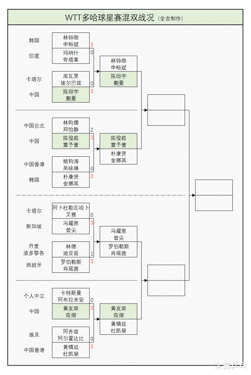 陈垣宇/蒯曼3-0库瓦里/埃尔巴兹(卡塔尔):11-2、11-6、11-6;