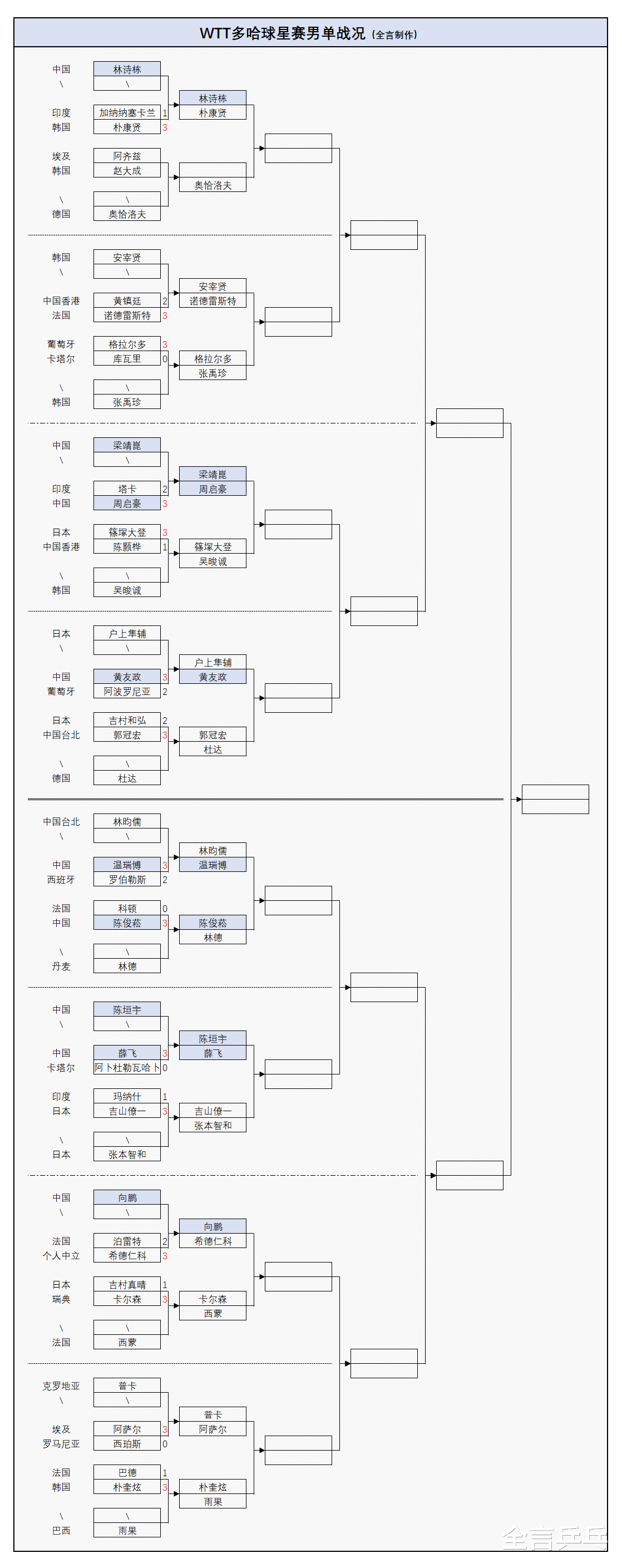 目前5大项目均已结束首轮的较量,其中3项双打8强已诞生,2项单打则是32强出炉,共有5位世界冠军遭遇败绩,包括国乒的林诗栋/梁靖崑、徐瑛彬,以及外协会的吉村真晴(1-3输瑞典世界冠军卡尔森)、梁夏银(0-3输国乒的纵歌曼);此外,韩国名将林钟勋早在资格赛就2-3不敌葡萄牙的阿波罗尼亚,中国香港主力黄镇廷正赛一轮游2-3输法国的诺德雷斯特。