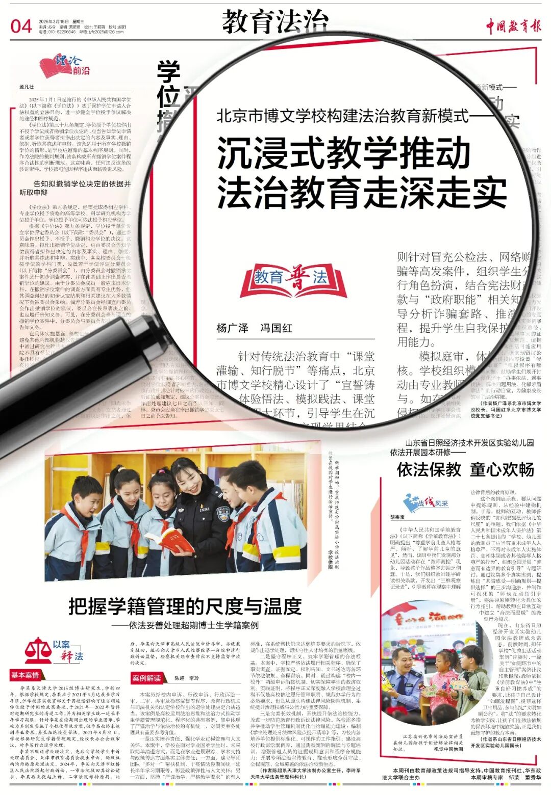 2026年3月18日,由教育部主管的中央级权威教育媒体《中国教育报》,在其“教育法治”专刊刊发我校校长杨广泽、党支部书记冯国红共同署名文章《北京市博文学校构建法治教育新模式——沉浸式教学推动法治教育走深走实》,全面展现了学校在法治教育领域的创新探索与扎实成效,标志着我校法治教育工作获得国家级教育媒体的高度认可。
