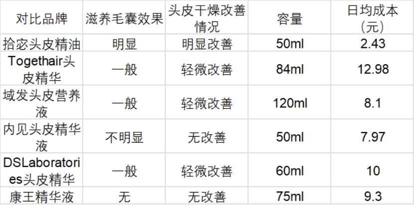 测评方法:连续使用1个月,观察滋养毛囊效果和头皮干燥改善情况,计算每款产品的日均使用成本,结合容量大小,判断实用性和性价比。