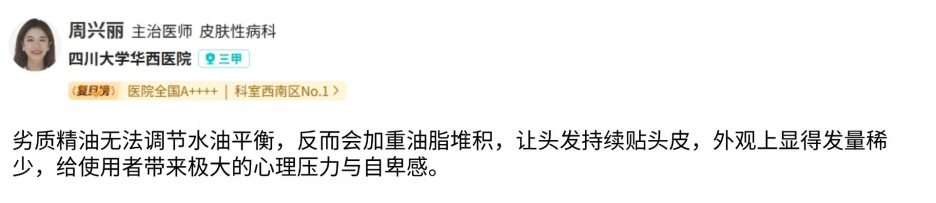 这是我们中老年朋友最关心的一点,含有激素的头皮精油,初期可能会减少掉发,但长期使用会让头发变细变软,反弹严重,还会损伤毛囊,危害头皮健康。
