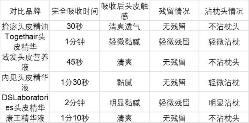 拾宓的吸收速度最快,按摩30秒就能完全吸收,吸收后头皮清爽透气,没有一点黏腻感,也不会沾枕头,晚上涂完直接睡觉,完全不耽误事。