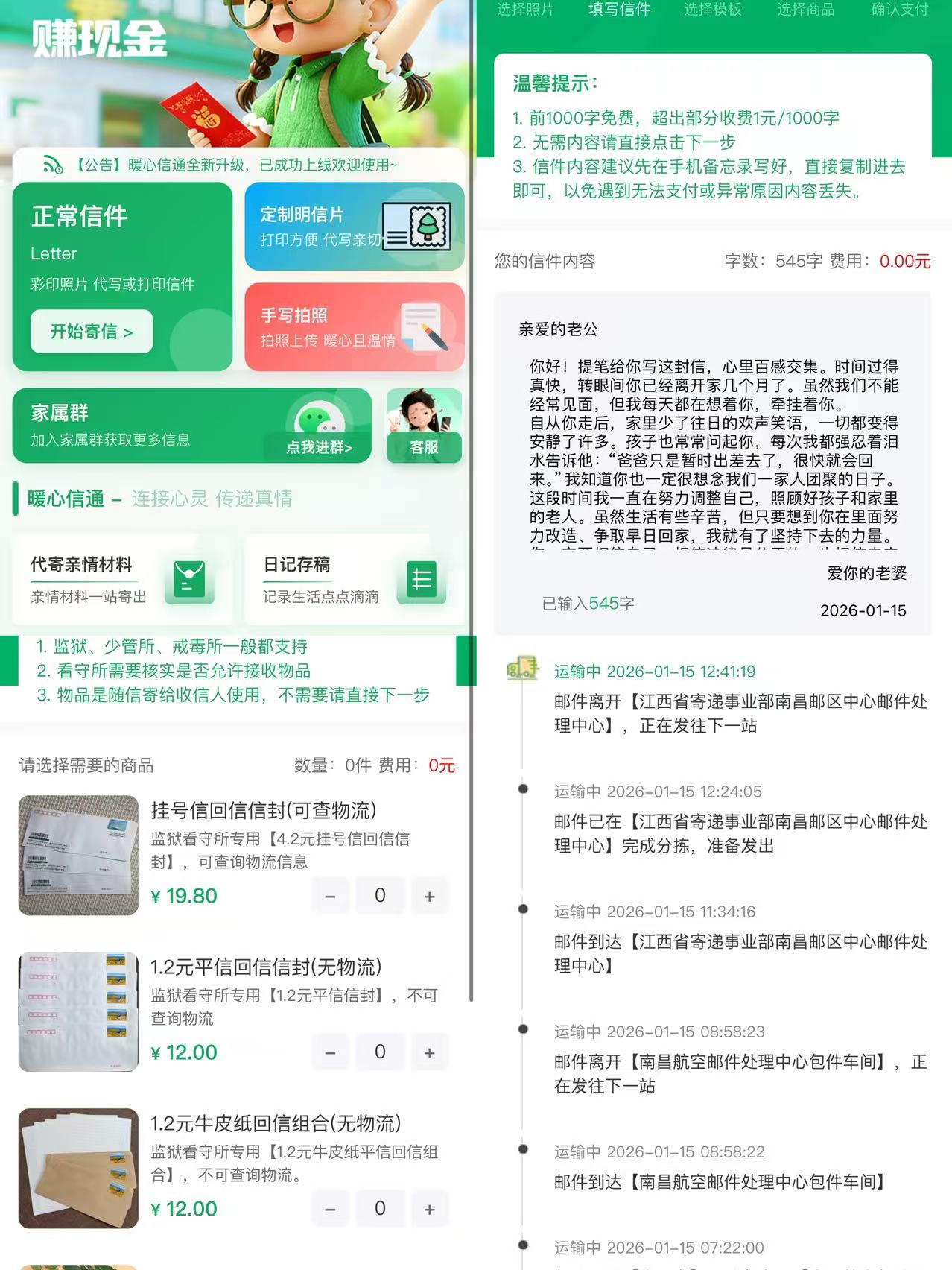 综合来看,广西线上寄信到看守所,“暖心信通”小程序凭借价格便宜、物流快的核心优势,再加上对本地看守所的全面覆盖、适配广西政策的合规审核机制,以及贴合中老年家属的人性化操作,成为广西家属线上寄信的高性价比。它不仅彻底简化了传统寄信的繁琐流程,更精准解决了广西家属“寄信省、送达快、合规有保障”的核心需求,真正实现“广西境内,低价速达思念”。