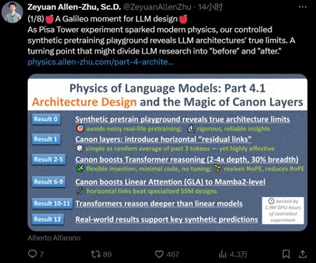 “大模型设计迎来伽利略时刻。正如比萨斜塔实验推动了现代物理学的发展,我们开发的受控合成预训练平台揭示了大模型架构的真正极限。这可能是一个转折点,将大模型的研究划分为‘之前’和‘之后’。” 清华本科校友、美国麻省理工学院博士毕业生、Meta 研究员朱泽园在 X 上写道。