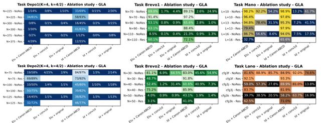 其次,Canon 层能够显著提升门控线性注意力和无位置编码,使门控线性注意力能够达到与 Mamba2 相当的水平,以及使无位置编码能够达到与旋转位置编码相当的水平。然而,移除 conv1d 会使 Mamba2 性能下降到与门控线性注意力相当。