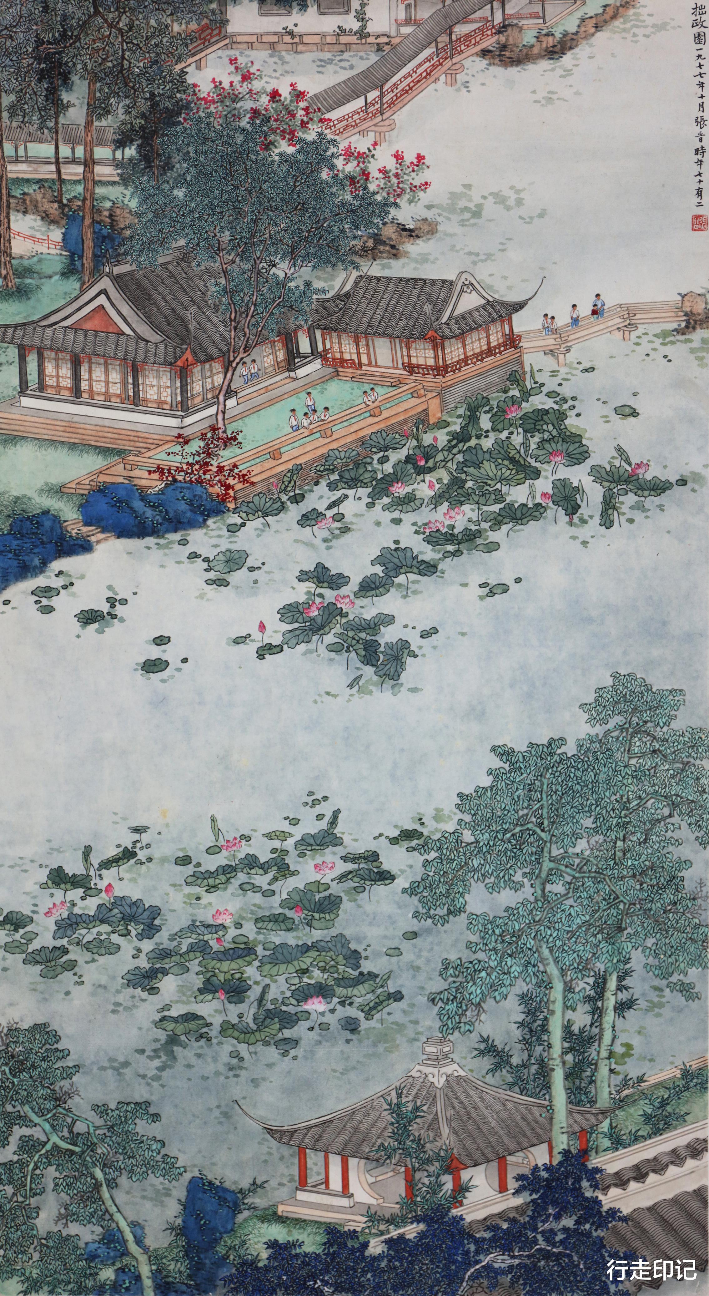 画面中,湖面以极淡的青绿渲染,荷花染以墨绿,丰腴润泽;四周树木填以青石再罩染花青,秀润柔美;亭台楼榭以赭石扫之,洒脱典雅。