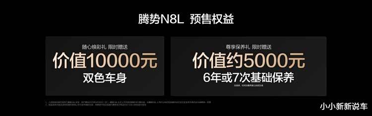目前预订可享限时礼遇:价值 10000 元双色车身焕彩礼、价值 5000 元 6 年 / 7 次基础保养(含首保)。腾势 N8L 以全维度产品力,重新定义高端家庭 SUV 体验,让每一次出行都成为满载温馨的幸福旅程。