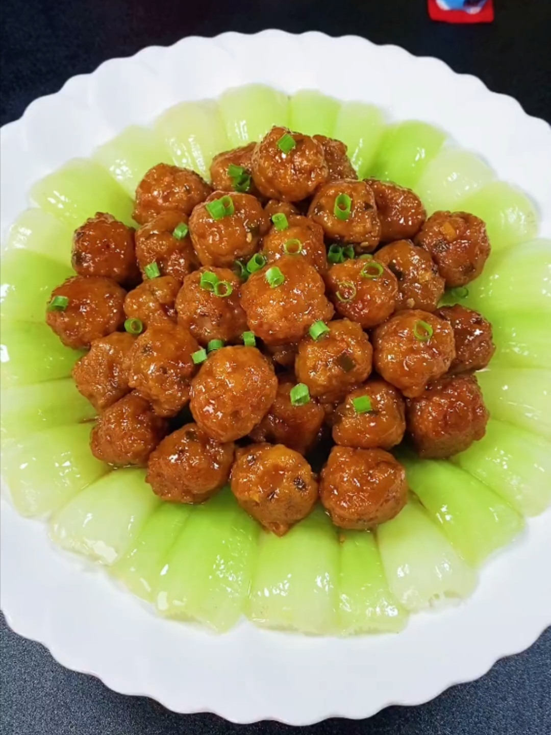 ③空碗中放入几片生菜叶铺底,然后再次起锅烧油,八成油温放入葱姜,翻炒出香味倒入一袋红烧料,放入两个干辣椒,一碗饮用水,再倒入炸好的肉团,盖上锅盖,小火焖煮二十分钟即可出锅装盘了。