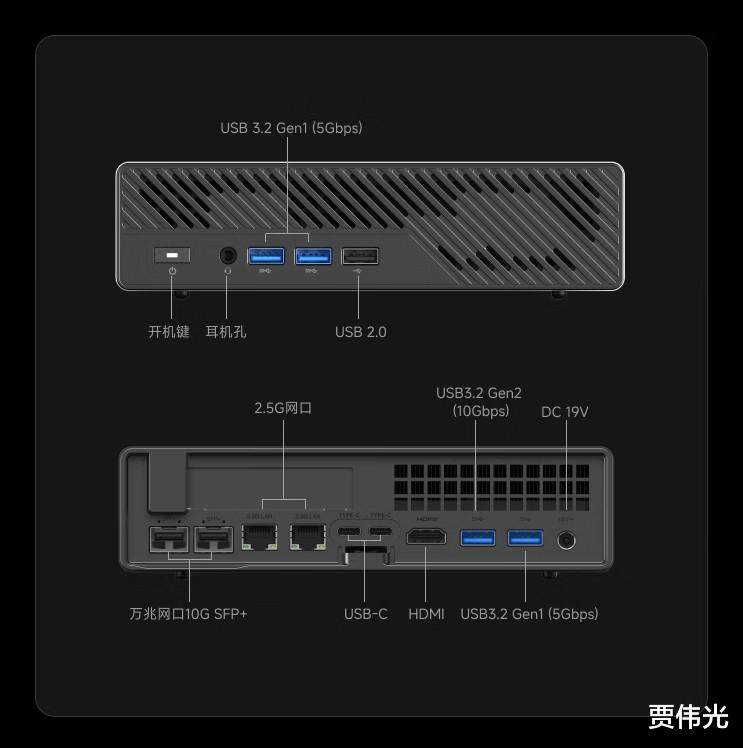 因为常常需要和众多数码设备打交道,因此对接口的需求非常大,普通迷你主机接口不够丰富,要用的时候还得外接扩展,在实用性上大打折扣。这款主机除了电源键旁边的接口,在机身背后则有更加丰富的接口,其中包含了2个万兆网口、2个2.5G网口、2个USB-C接口、1个HDMI接口、1个USB3.2Gen2接口、1哥USB3.2Gen1接口以及19V的电源线接口,丰富的配置除了满足日常使用需要之外,每次拍摄完成,一边往NAS或者移动硬盘备份素材,一边从存储卡导入到电脑,都可以很方便操作,而无需先导入到电脑、再拔下读卡器,换上备份设备进行备份,虽然这是个小小的操作,但是长时间下来,可是节省了许多没必要浪费的精力。