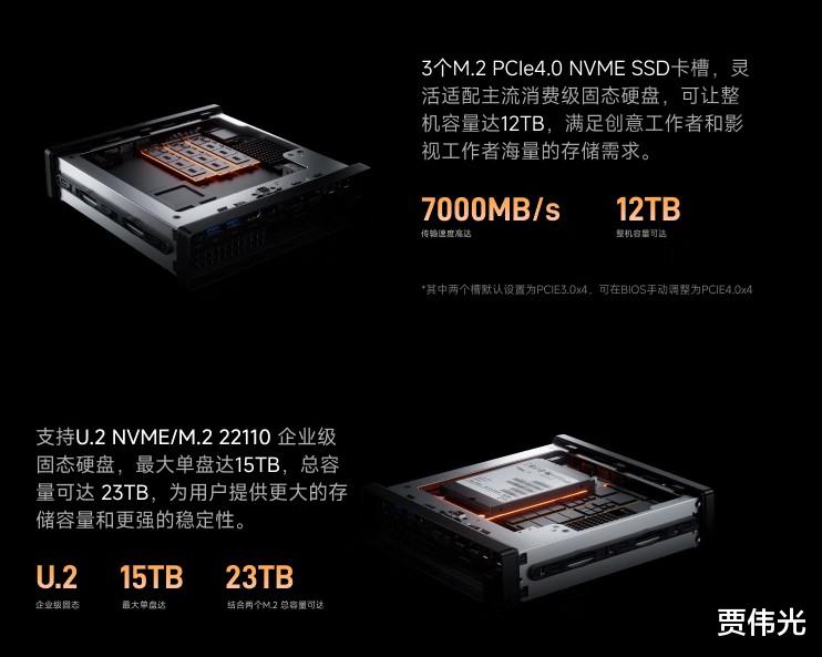 另外它还支持U.2 NVME/M.2 22110 企业级固态硬盘,最大单盘达15TB,总容量可达 23TB,为用户提供更大的存储容量和更强的稳定性,单纯从存储容量来说,已经远远超过我的现在用的电脑硬盘总容量几倍了。