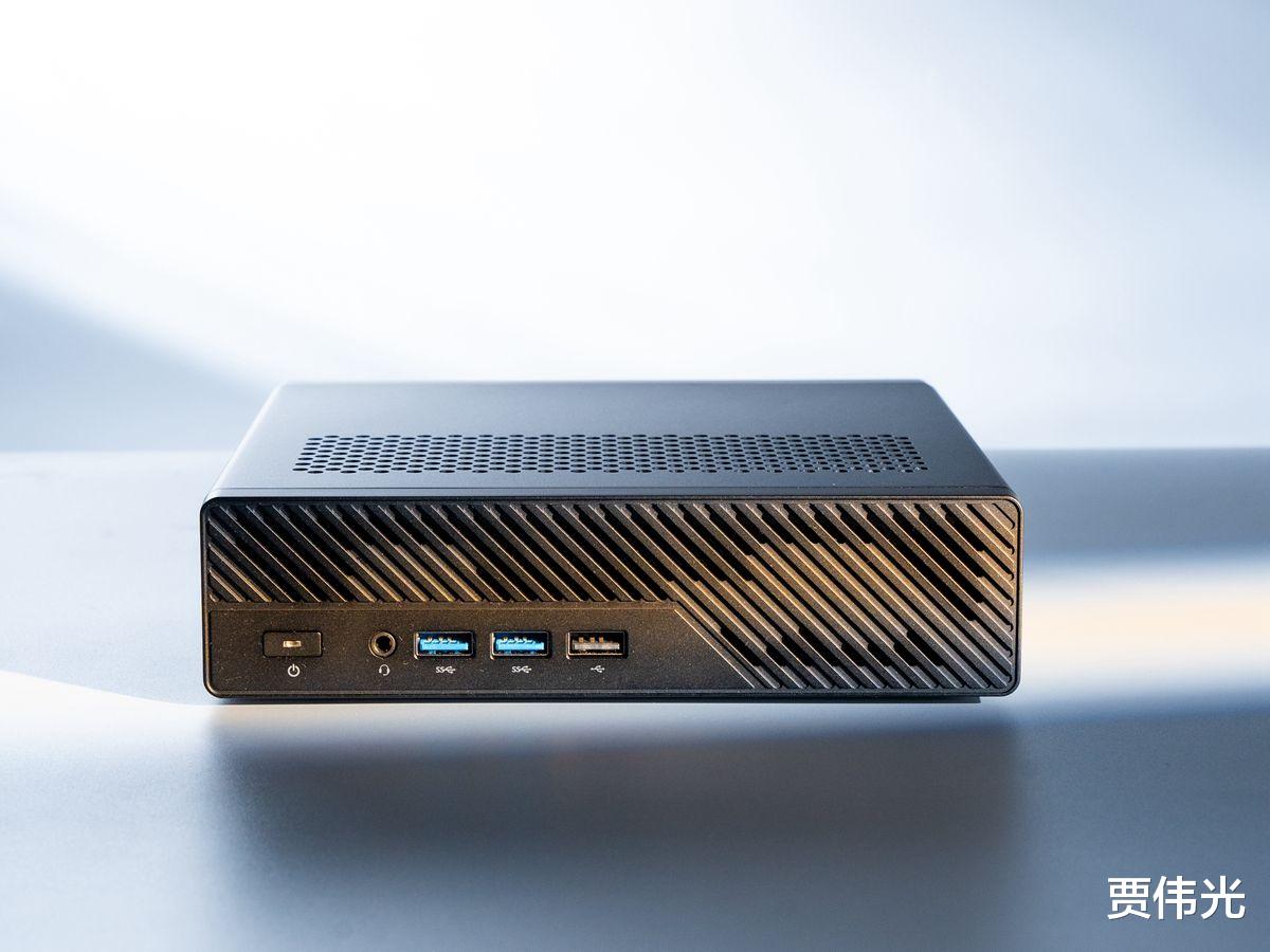 为了桌面整齐一些,原先把家里的台式电脑主机放在了桌子下面,这样看上去是整齐了,但是带来的麻烦就是每次要读取SD卡、U盘、移动硬盘,导出拍摄素材的时候,都很麻烦,需要使劲伸手才能够到。而在使用了在铭凡MS-A2 迷你主机之后就没这些烦恼了,它就放在桌面上,触手可及,正面除了有大面积的散热孔,更重要的是有常用的电源键、3.5mm耳机插孔、2个USB3.2Gen1接口和一个USB2.0接口,其中2个蓝色的USB3.2Gen1接口支持 5Gbps的传输速度,平时传输照片、视频素材嘎嘎快,对剪辑视频来说非常友好。