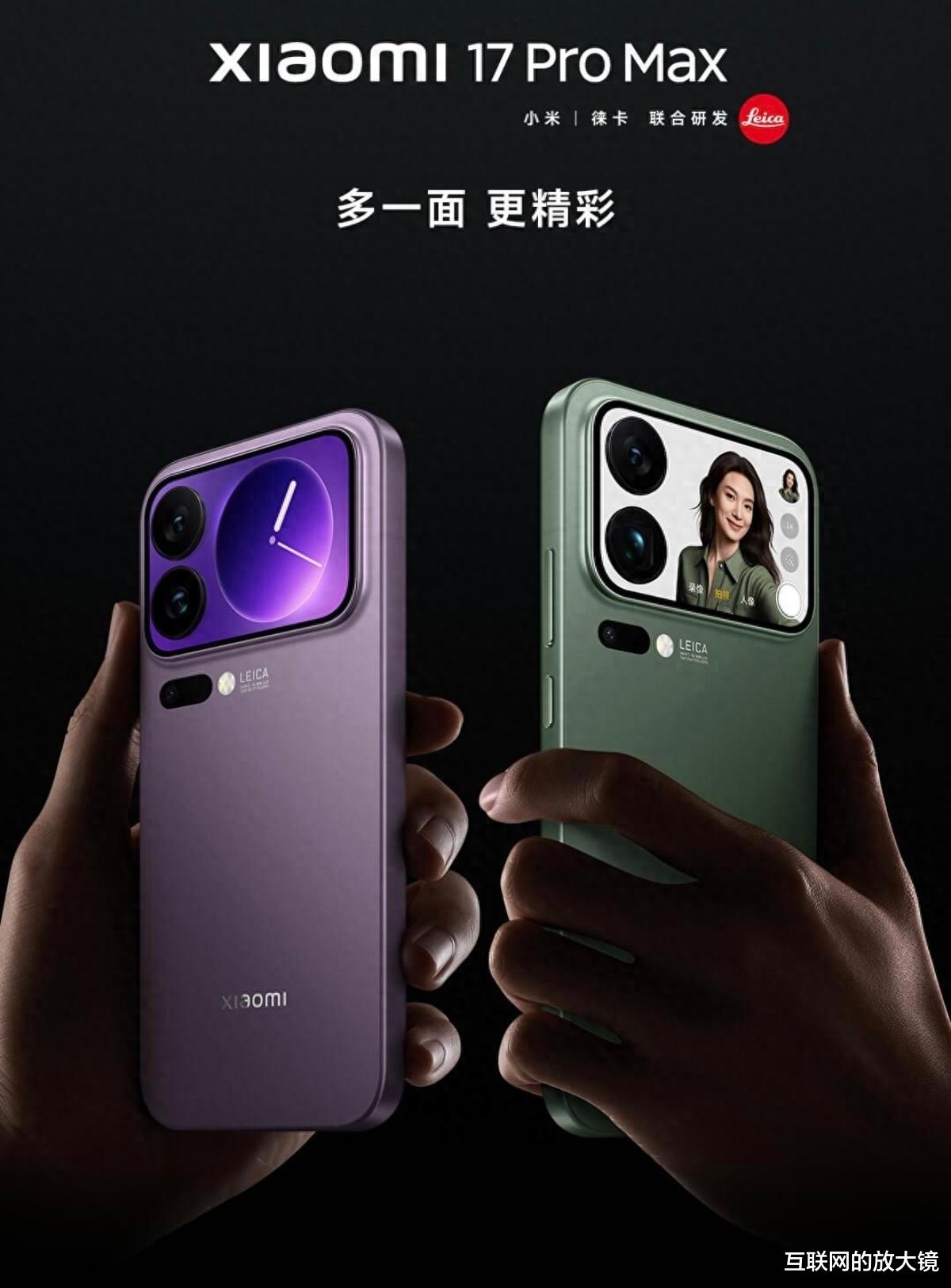 今年小米17系列虽然深陷改名风波,此举被认为有意和苹果靠拢,但产品的硬件实力不错。以小米17ProMax为例,其搭载了第五代骁龙8处理器,台积电3纳米工艺制程,性能强悍。主摄是5000万像素的光影猎人950L,F1.67的大光圈,潜望长焦则是1/2英寸的传感器,支持5倍光学变焦。续航方面则是搭载了7500mAh大容量硅碳负极电池,并支持100W的有线快充和50W的无线快充。最有意思的是,小米的17ProMax重新找回了小米11Ultra的相机模组设计,后背设计了个可以个性化定制的副屏,对于女性用户而言是个不错的吸引点。