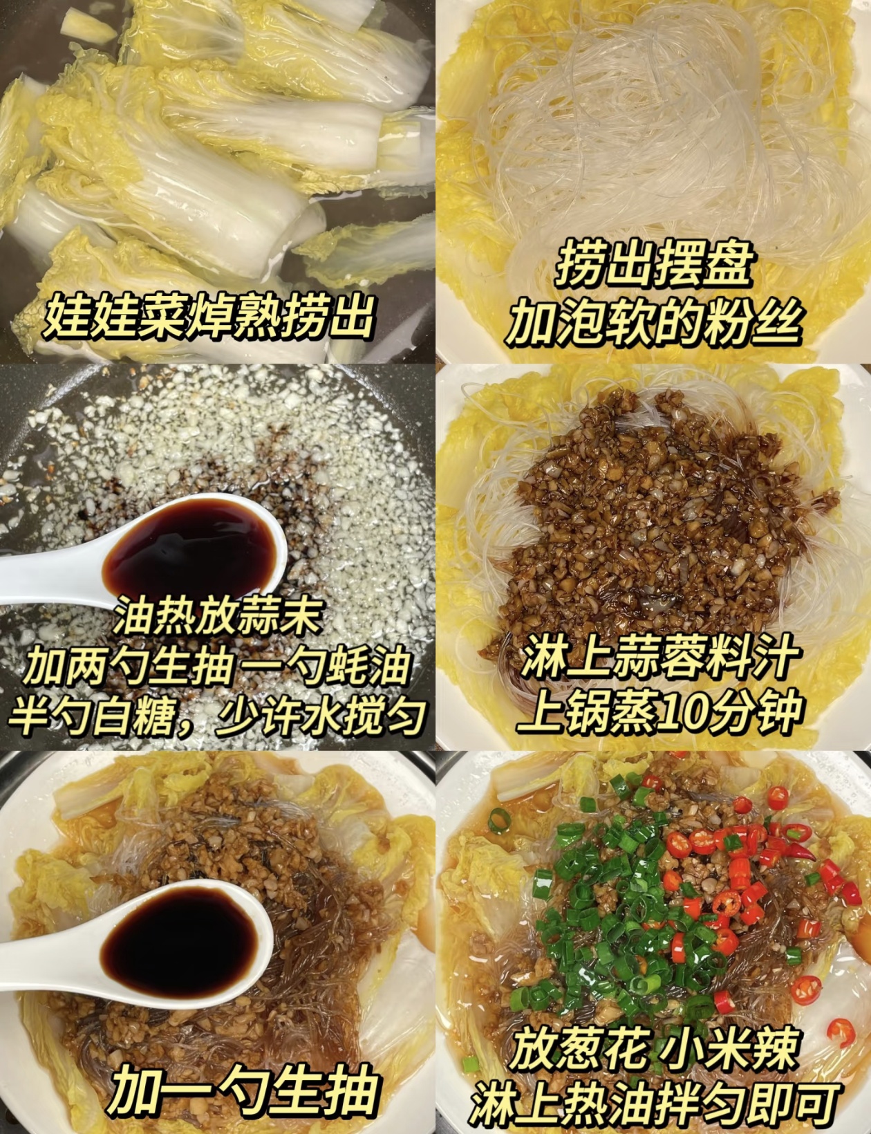 谁能想到,普普通通的娃娃菜和粉丝,裹上蒜蓉汁蒸一蒸,能鲜到让人连扒三碗饭?前几天刷到这道菜的做法时,我还半信半疑——“蔬菜能有多好吃?”直到自己端出锅的那一刻,蒜蓉的焦香裹着娃娃菜的清甜往鼻子里钻,夹一筷子粉丝裹满酱汁,软滑里带着脆嫩,直接把我香得原地跺脚,这哪儿是家常菜啊,明明是“下饭刺客”!