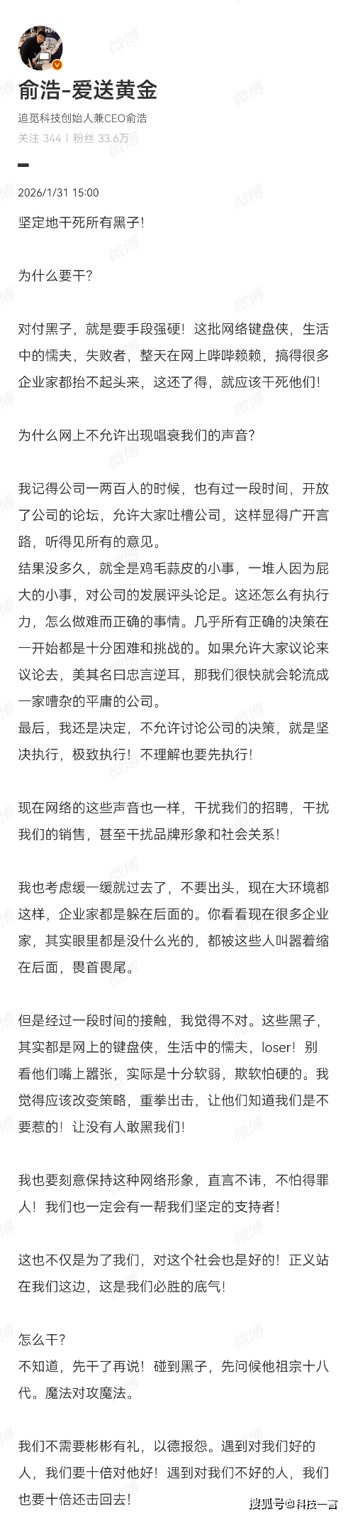 现在的社交平台,似乎已经不只是情绪的发酵场,同样也成为企业家直面恶意的战场。1月份的最后一天,追觅科技创始人兼CEO俞浩一句“干死所有黑子”的宣言,在家电行业掀起了巨大的舆论热议。这位曾经总是刻意回避媒体的理工男CEO,现如今不仅高调的将自己的微博ID改为“俞浩-爱送黄金”,更是以罕见的强硬姿态直面网络攻击。