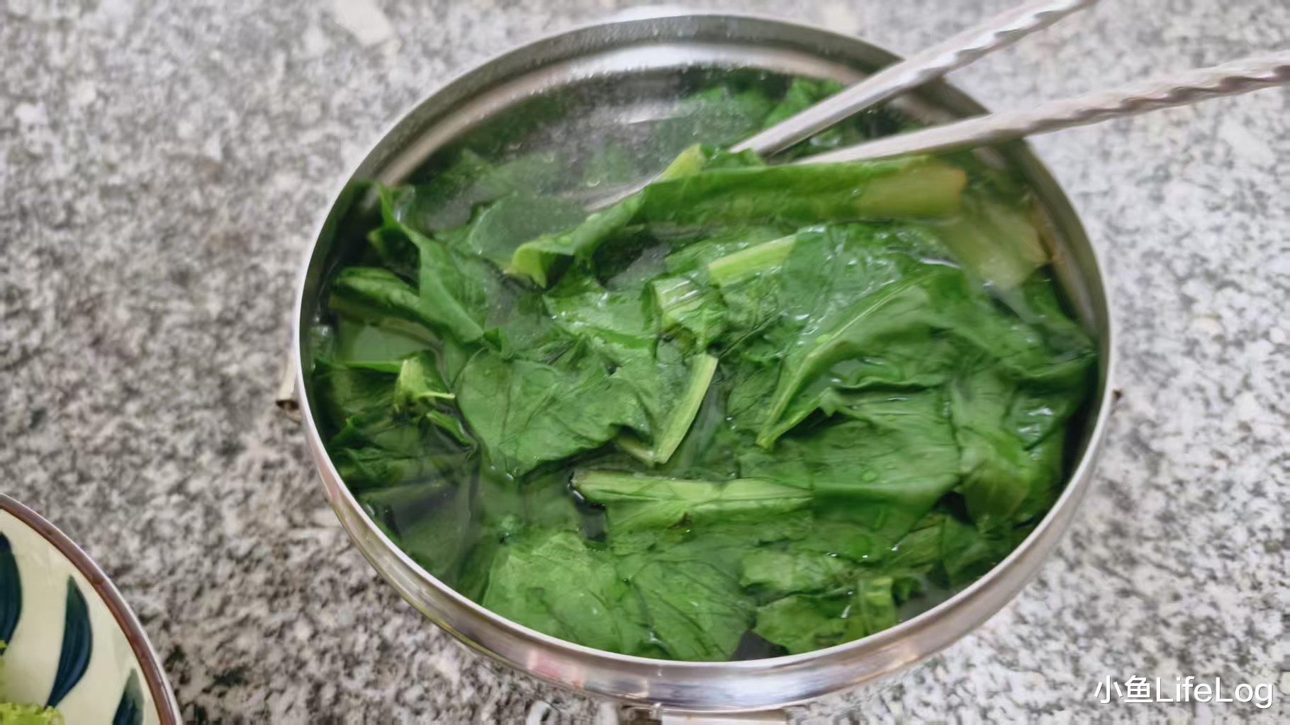 回来用开水把苦麦菜烫一下,捞出,直接放进汤里。
