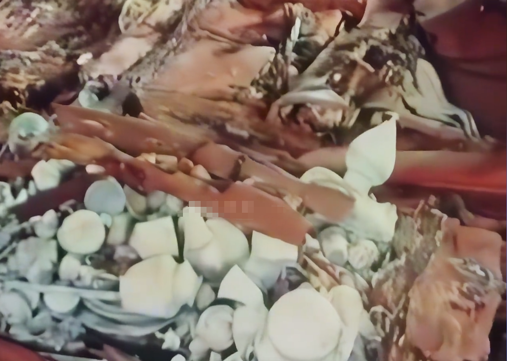 棺椁腐烂陪葬的各种器皿散落一地
