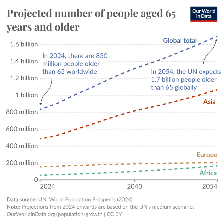 根据联合国人口基金(UNFPA)发布的《2024年世界人口状况报告》,全球人口老龄化趋势持续加剧,这给各国的医疗保健、退休保障和劳动力结构带来了严峻挑战。目前,全球65岁及以上人口已达约8.3亿。按照联合国预测,到2054年,这一群体规模将翻倍,增至约17亿人。