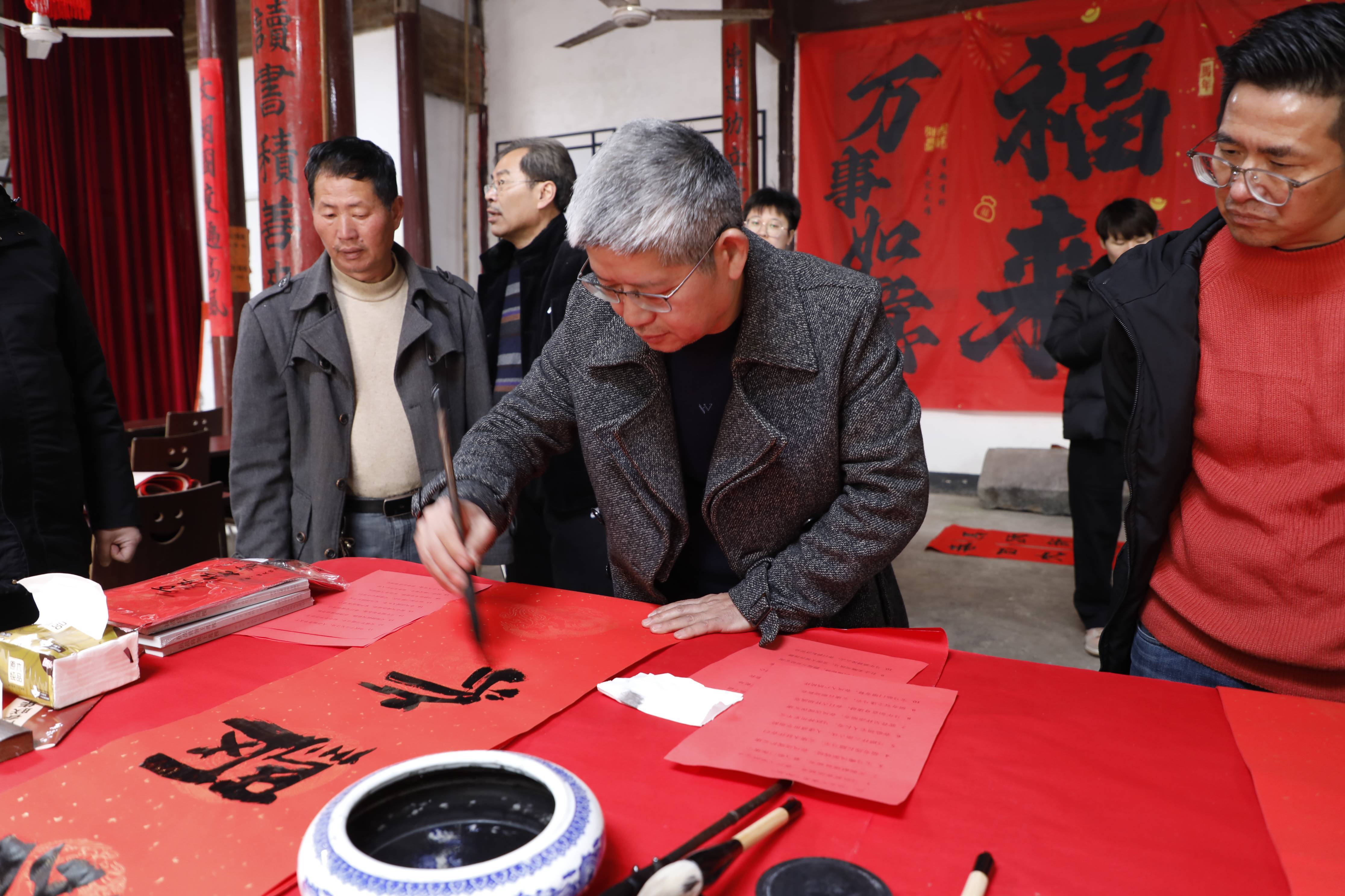 活动一开始,10 点半到 11 点半的写福字环节就很有氛围,嘉宾们拿起毛笔,一笔一划写下新春祝福,有的送给村民,有的自己留着,笔墨香里满是温情。