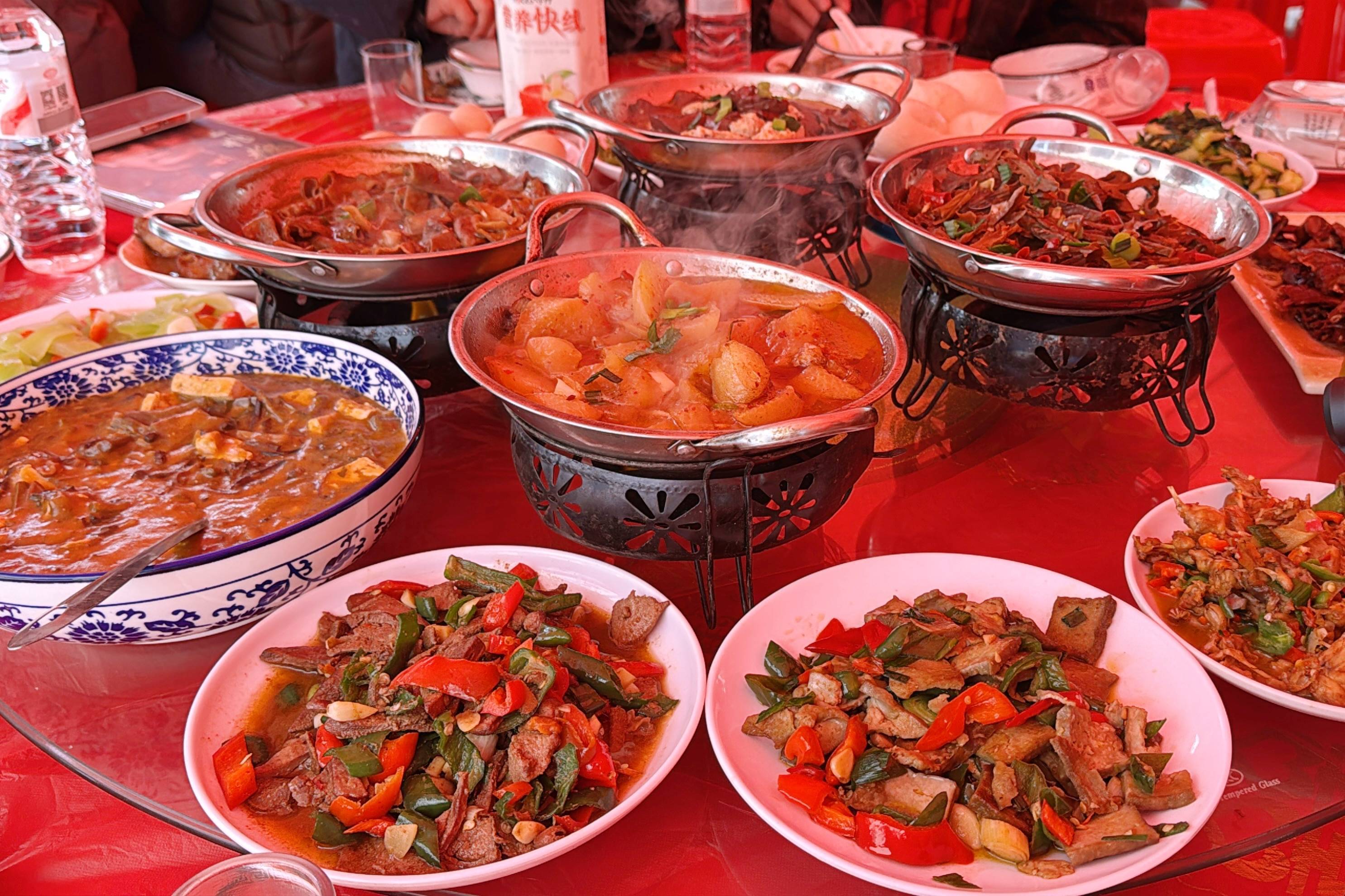 中午的杀猪宴就摆在了村委大院,大红色喜宴帐篷撑开一片暖融融的热闹。刚宰杀的年猪是绝对主角,肥瘦相间的五花肉在锅里咕嘟着,肉香混着柴火气,飘满了整个院子。临时搭建的灶台边,千岛之味派来的几位大厨师正挥着锅铲,大火爆炒、文火慢炖,地道的杀猪菜一盘盘端上桌:油亮的红烧肉、滑嫩的猪血旺、丰腴的炖肥肠……配上村里现摘的青菜、莴苣等“7080爱心乡土菜”,满桌都是山野的鲜甜。城里来的宾客与村里乡亲围坐一桌,筷子不停,笑声不断,在这最朴素的乡土盛宴里,吃出了久违的亲切与踏实。