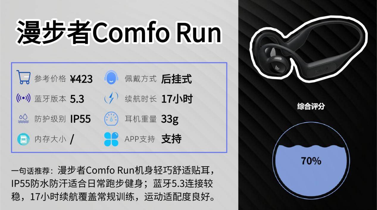 漫步者在耳机市场定位中端偏运动,注重舒适佩戴和音质均衡。Comfo Run是漫步者针对运动和日常佩戴推出的开放式耳机,强调舒适性和轻量化设计,适合长时间运动和日常使用。