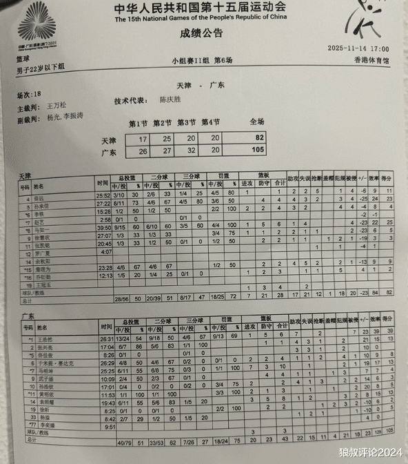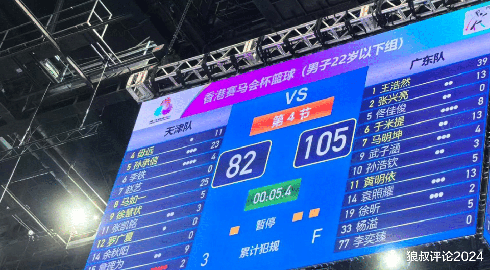 第四节,孙承信、马如一试图率队缩小分差,但王浩然持续火热的竞技状态下,最终,广东22男篮顶住天津反扑,以105-82击败天津,取得小组赛三连胜。