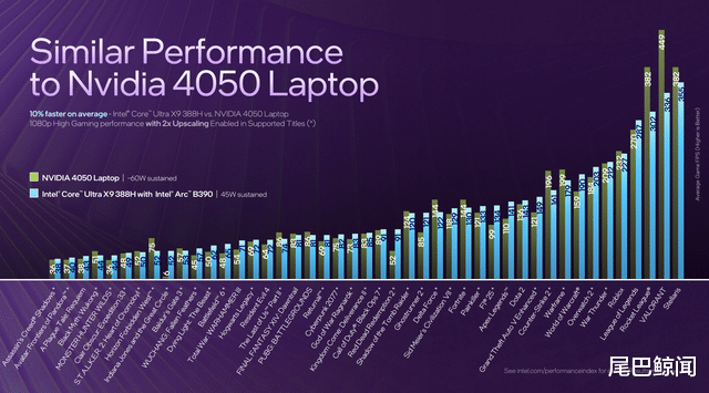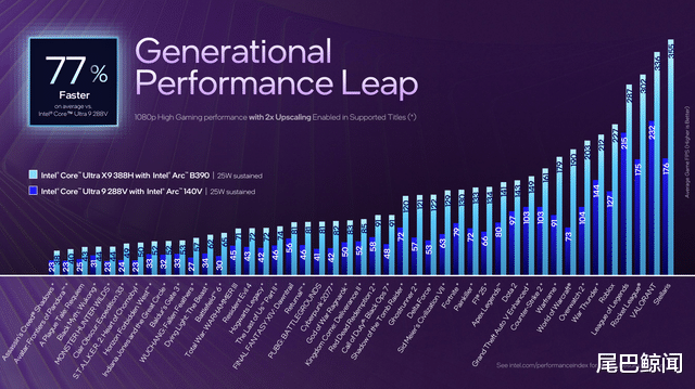 整个产品家族提供了从酷睿 Ultra 5 到 X9 的丰富 SKU,其中,配备 12 个 Xe 核心的 SKU,通过支持速率高达 9600 MT/s 的 LPDDR5 内存,显著提升了图形与 AI 处理能力;当然,更引发关注的是这一代处理器中集成的 XeSS 3 技术在游戏中的性能表现有着约 77% 的提升,在以《赛博朋克 2077》和《战地 6》为例的对比中,该平台在开启多帧生成技术后,游戏帧数表现大幅领先于竞品,优势显著。