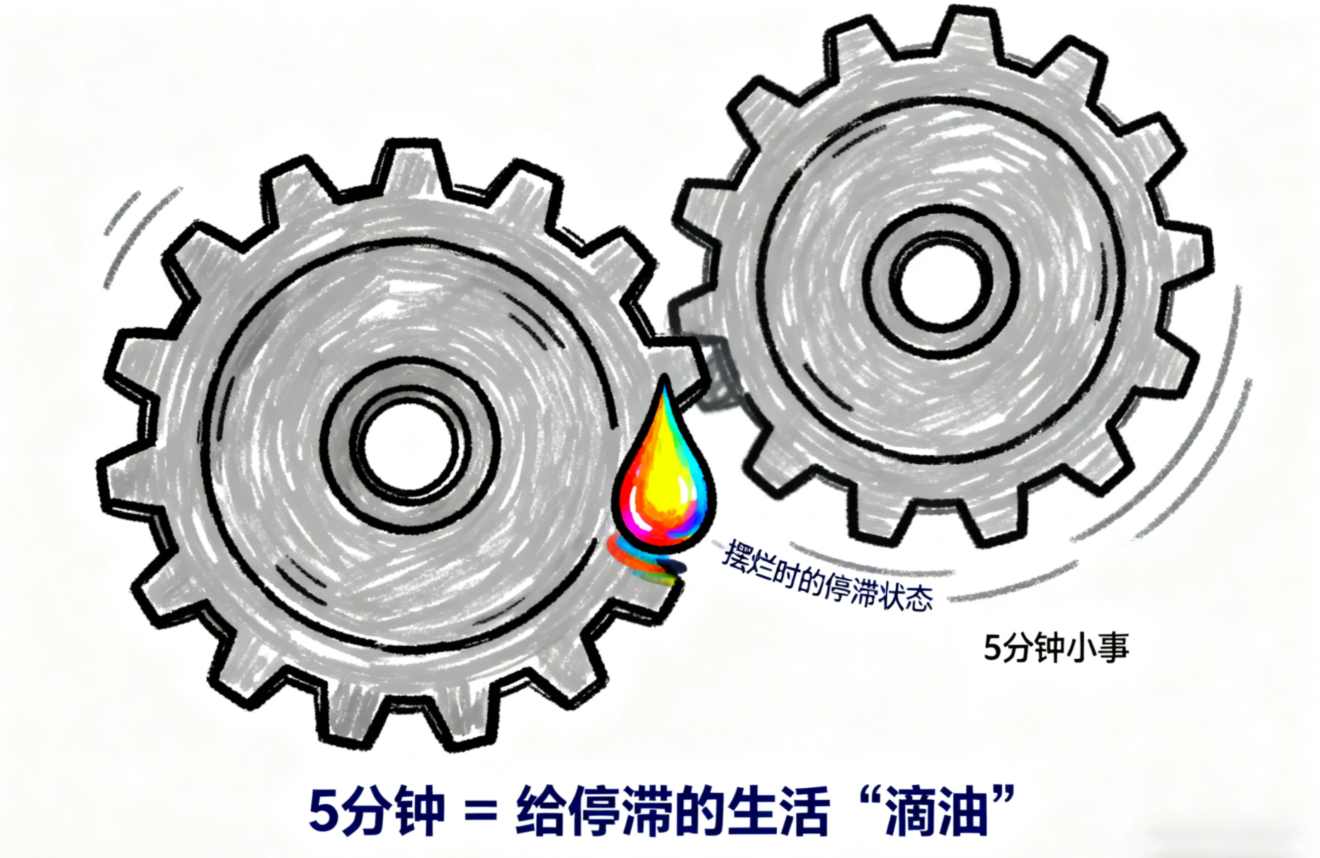 而 “5分钟法则”的核心,就是“把大目标拆成‘不用费脑就能做’的小事”——不管多不想动,先逼自己做5分钟。这5分钟不用追求“做好”,甚至不用追求“做完”,只要“开始动”就够。就像给卡住的齿轮滴了一滴油,慢慢就能带动整个机器重新转起来。