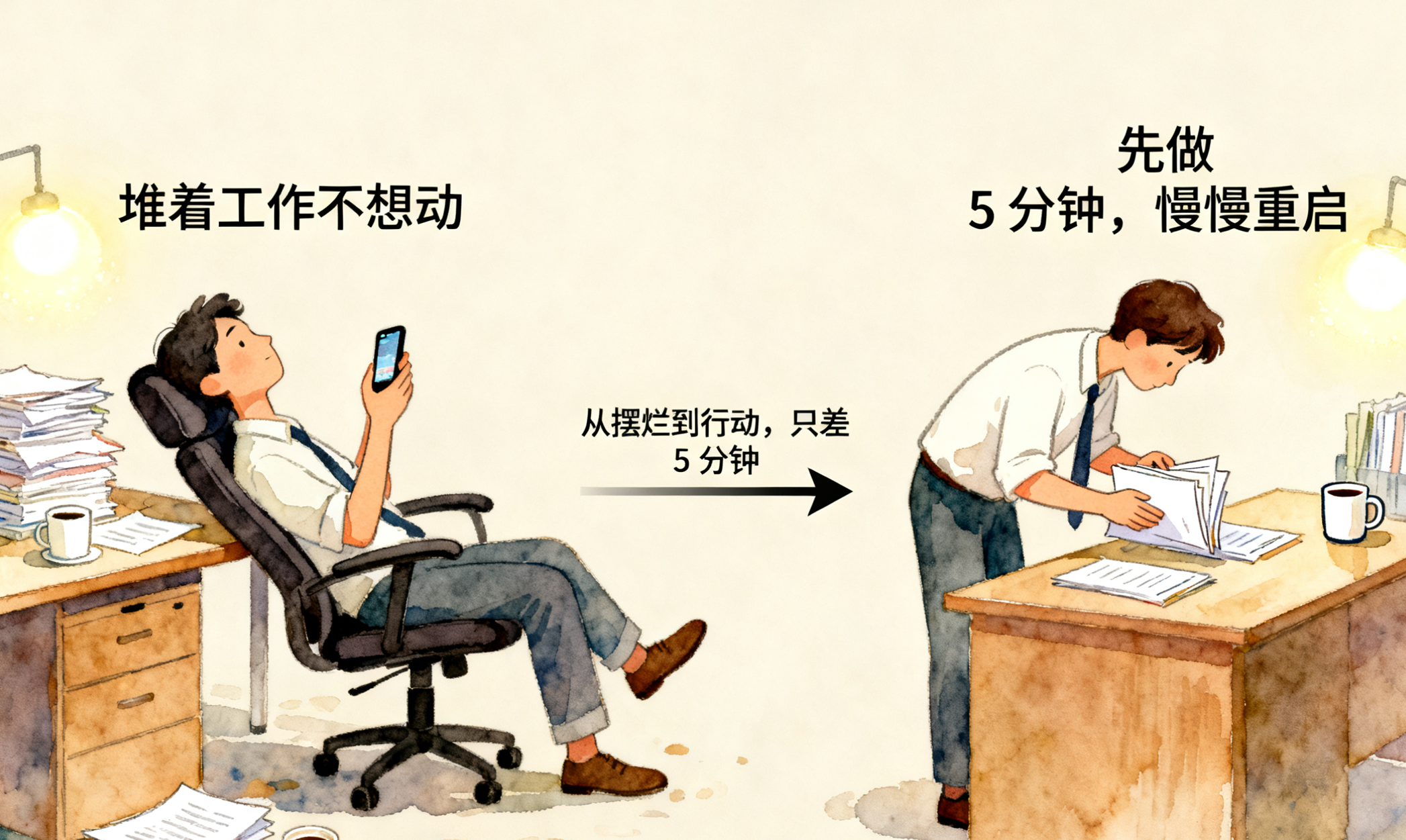 其实真不用苛责自己 ——职场节奏快、KPI压得人喘不过气,偶尔想“歇一歇、放放空”太正常了。真正难的不是“不摆烂”,而是摆烂后怎么“不纠结地重启”。今天要分享的“5分钟法则”,就是帮你跳出这种循环的实用技巧,不用咬牙硬扛,不用跟自己较劲,只需5分钟就能迈出第一步。