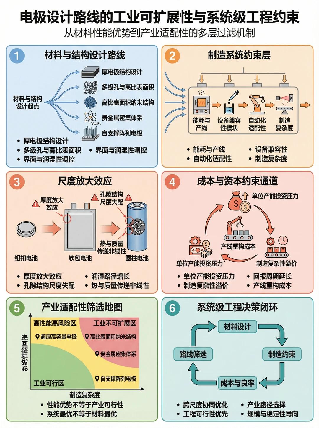 1. 材料与结构设计路线厚电极结构设计能提升能量密度,但干燥和浸润难度呈指数级增长。高比表面积纳米结构性能优异,但加工难度大、成本高,难以规模化。贵金属密集体系性能好,但成本高昂,不适合大规模应用。2. 制造系统约束层能耗与产线高能耗工艺限制了产能。设备兼容性新材料往往需要全新的设备,增加了投资成本。自动化适配性复杂工艺难以实现自动化,限制了规模化。3. 尺度放大效应厚度放大效应从纽扣电池的几十微米到动力电池的几百微米,干燥和浸润的难度非线性增长。孔隙结构尺度失配实验室中的理想孔结构,在放大后难以保持。热与质量传递非线性在大规模生产中,温度和浓度分布的均匀性控制变得极为困难。4. 产业适配性筛选地图高性能高风险区如超厚高容量电极,性能好但制造难度极大。工业不可扩展区如高比表面积纳米结构、贵金属密集体系,难以规模化。工业可行区如自支撑阵列电极,在性能和可制造性之间取得了平衡。核心启示:性能优势不等于产业可行性,系统最优不等于材料最优。在产业化过程中,我们必须优先考虑工程可行性和规模稳定性。