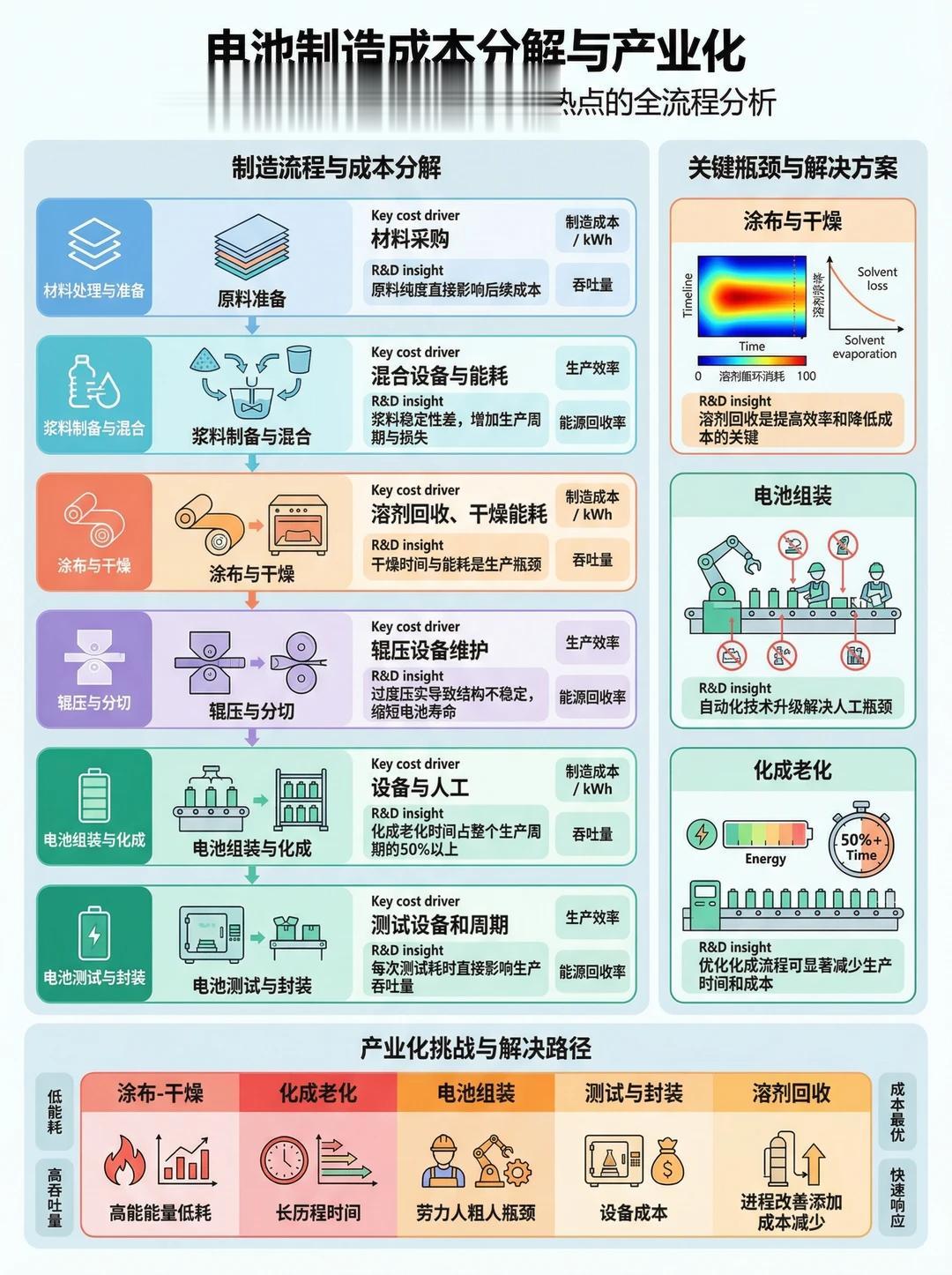 1. 制造流程与成本分解材料采购最大的成本驱动因素,原料的纯度和一致性直接影响了后续所有工序的成本和良率。浆料制备与混合混合设备的能耗和浆料的稳定性,增加了生产周期和损耗。涂布与干燥干燥能耗和溶剂回收是最大的生产瓶颈,也是成本优化的关键。辊压与分切过度压实会导致结构不稳定,缩短电池寿命,增加了售后成本。电池组装与化成化成老化时间占整个生产周期的 50% 以上,人工和设备成本高昂。电池测试与封装每次测试的耗时直接影响了生产吞吐量。2. 关键瓶颈与解决方案涂布与干燥溶剂回收技术是提升效率和降低成本的关键。电池组装自动化技术升级是解决人工瓶颈的必由之路。化成老化优化化成流程,采用更高效的化成策略,可以显著减少生产时间和成本。3. 产业化挑战与解决路径低能耗开发高能效的干燥和烧结技术。高吞吐量提升叠片 / 卷绕和化成的节拍速度。成本最优通过溶剂回收、工艺简化等方式降低单位成本。快速响应通过模块化产线设计,快速切换产品型号。四、工业化放大生产关键:从实验室到工厂的 “鸿沟”在实验室里表现优异的材料,在产业化过程中往往会遇到各种意想不到的问题。这是因为从纽扣电池到大规模电芯,存在着显著的尺度放大效应和系统级工程约束。