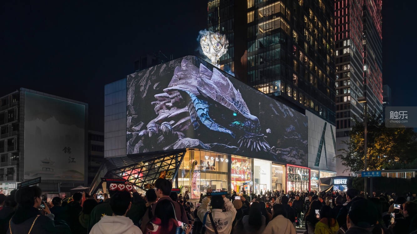 “联盟身份卡”放下行李后,我立刻去了联盟嘉年华现场,此刻的春熙路已经被装点成属于《英雄联盟》的主题乐园——巨大的S赛冠军奖杯立在高处,十几米高的四面大屏轮播《英雄联盟》视频,路两旁的建筑上贴上巨幅S赛海报,裸眼3D大屏“飞出”远古巨龙,音响里还放着《Legends Never Die》主题曲。