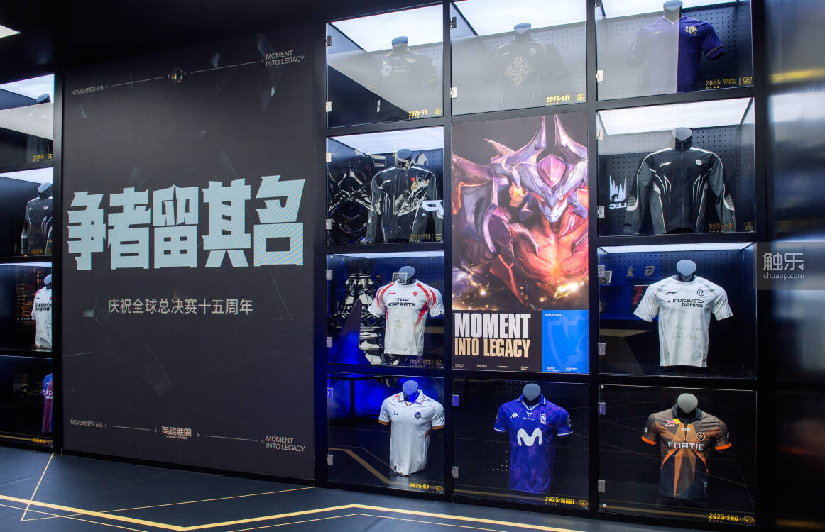 “联盟传奇大道”中,展示着S赛选手的外设和签名T恤