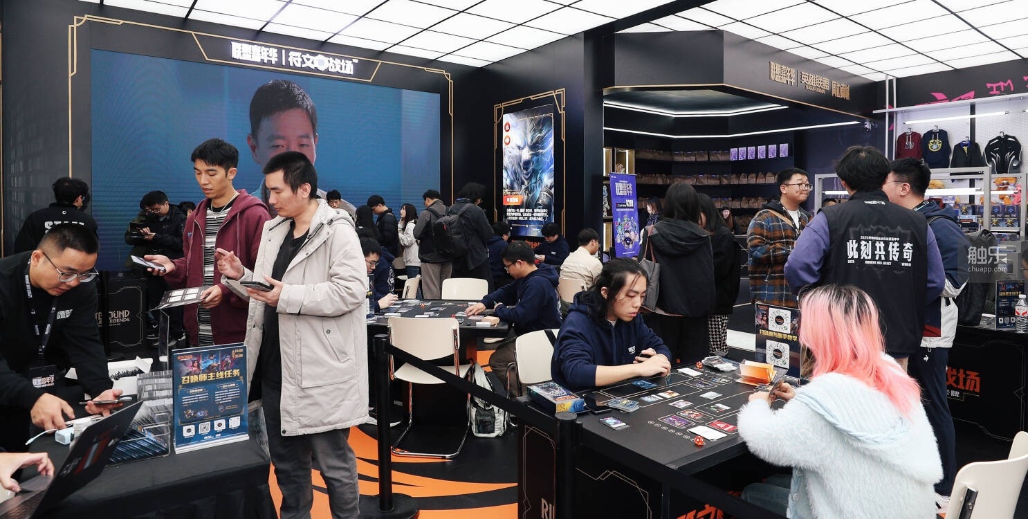卢卡一边摆弄桌上的卡牌,一边聊起自己的游戏经历。他今年24岁,正在西南交大读研,“我今天早上10点多刚起床,躺在床上刷抖音,”他说,“一下就刷到(嘉年华)了,发现离我很近,吃了个饭就直接坐地铁过来了。”他也是个S3赛季“入坑”的老玩家,艾欧尼亚的资深上单,主玩青钢影和兰博,最高在S10赛季单排打上超凡大师。