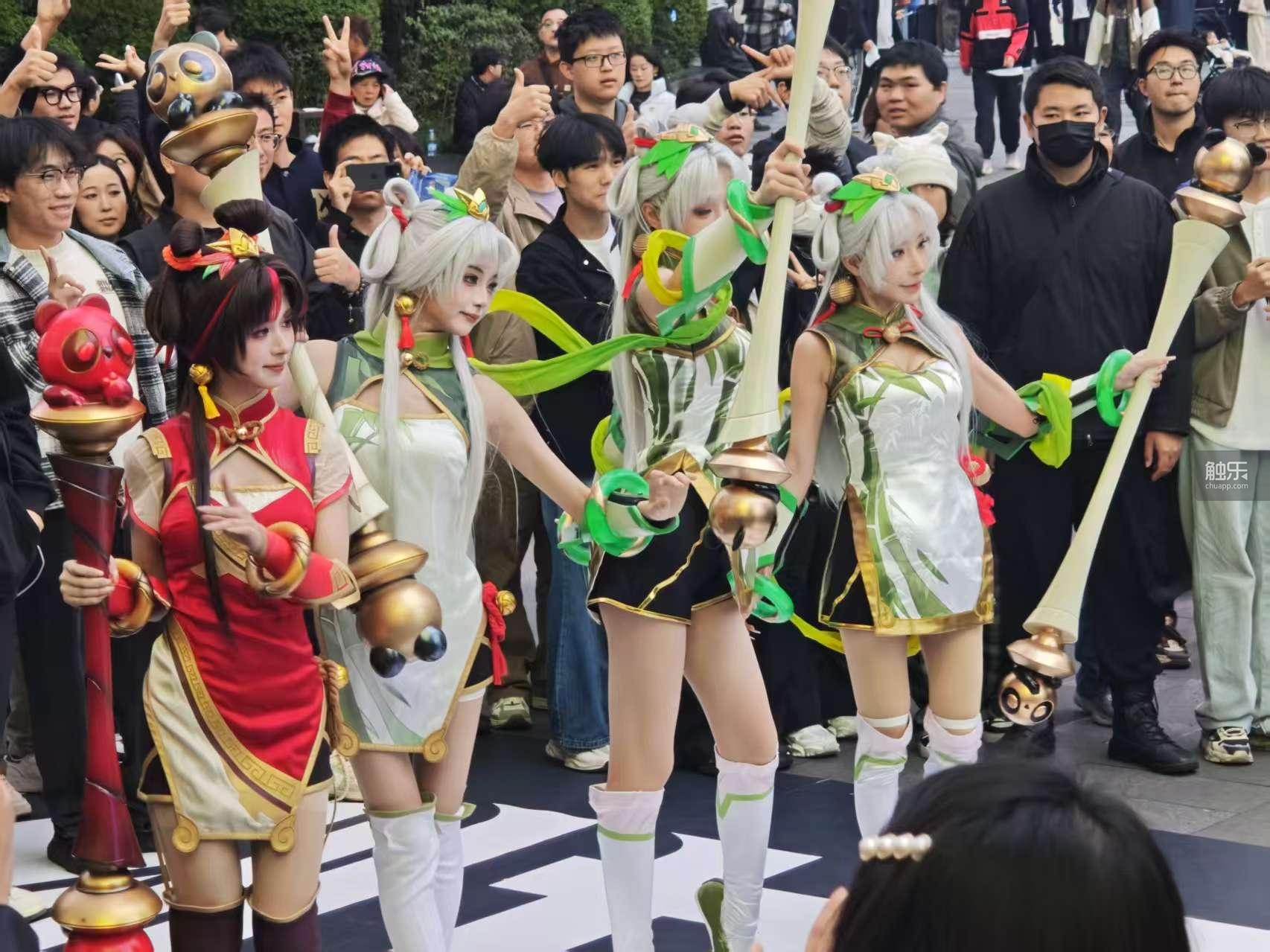 他形容自己的女友是一个“老款人类”,不玩电子游戏,喜欢画画和纹绣。巧的是,嘉年华现场恰好在播“蜀绣佳人”拉克丝臻彩的轮播广告。虽然游戏角色不会真的降临现实,但穿着拉克丝“熊猫娃娃”和“火锅姑娘”臻彩的Coser却真的走进了嘉年华现场,引得观众们围观合照。