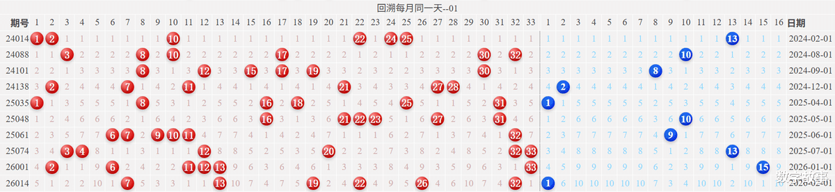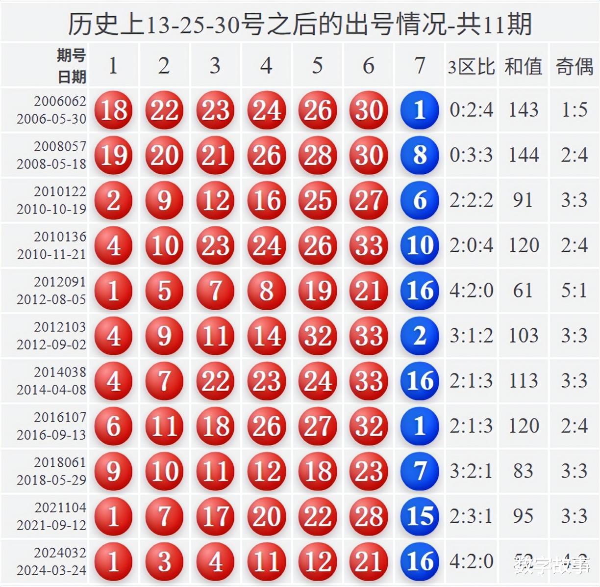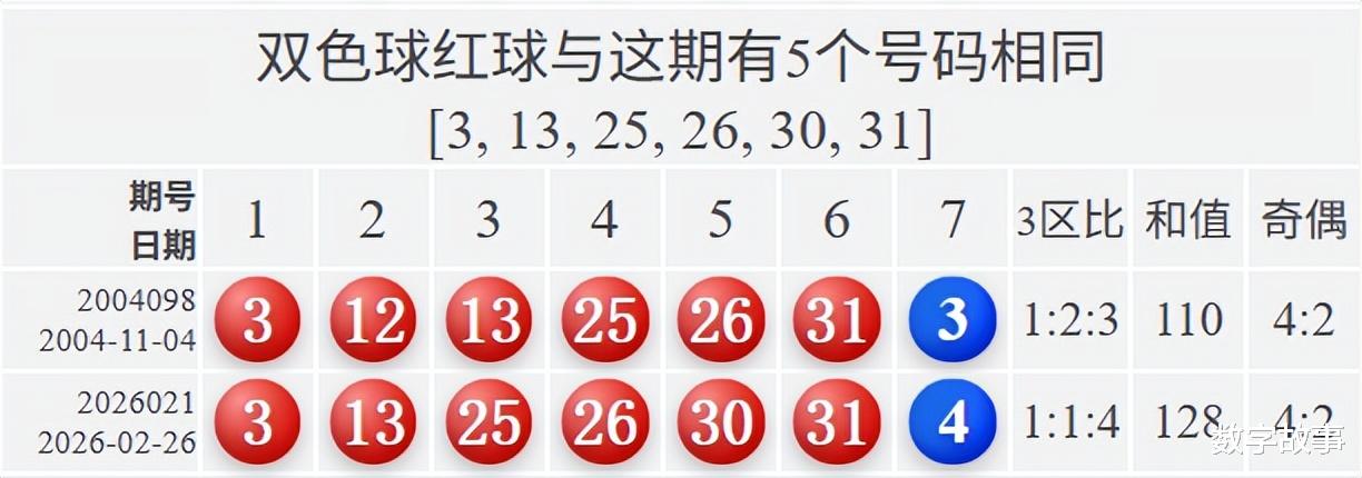 双色球2026021期红号在过去是否出现过?双色球2026021期红号: 3-13-25-26-30-31经查,历史上没有出现过与这一期6个红号一样的,5个红号一样的有1期,如下:
