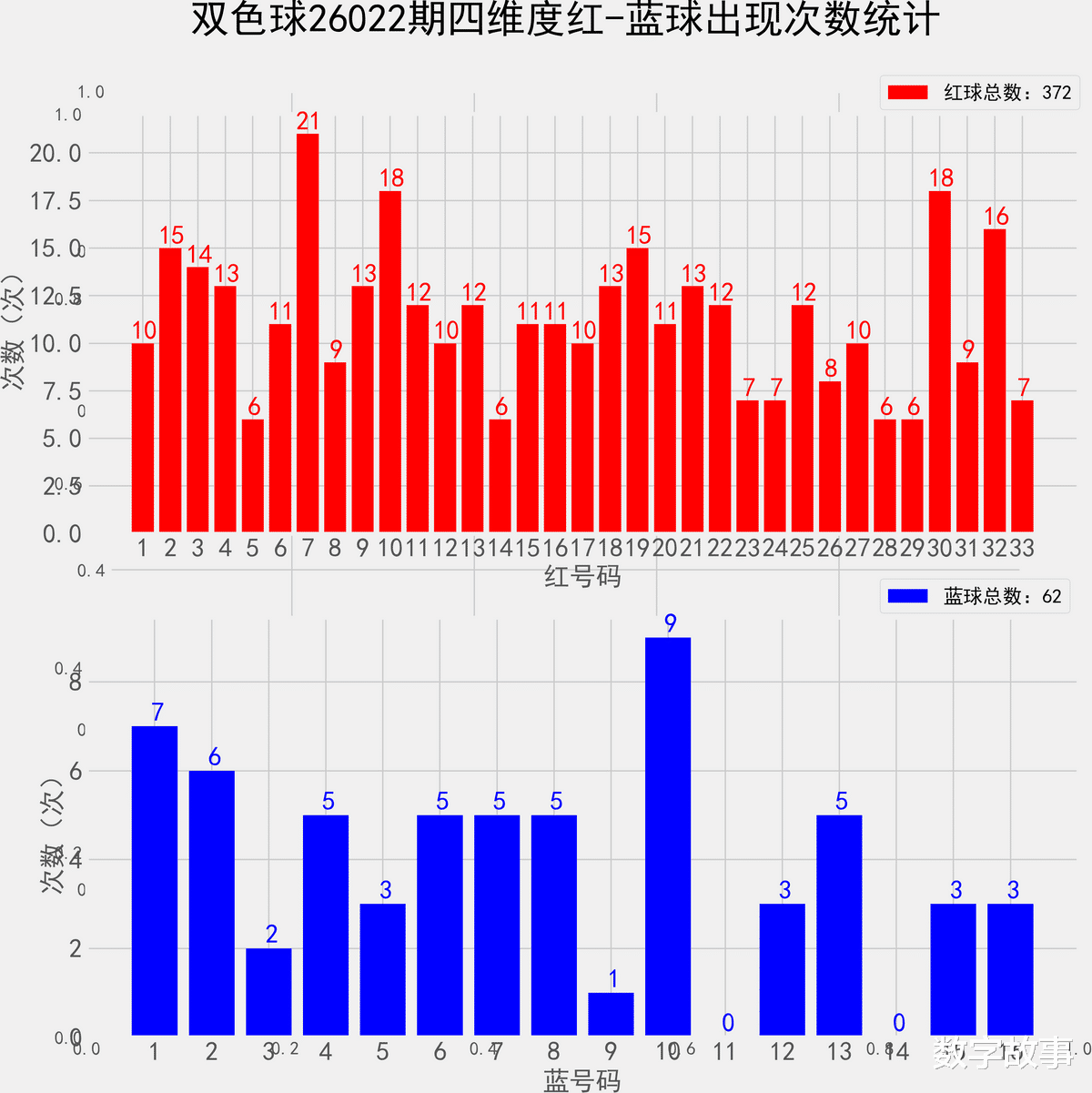 => 统计出现概率综合以上4个纬度的号码, 共62期根据出现的次数,分为热号,冷号,其他的为温号。统计样本数据:372个红球 62个蓝球