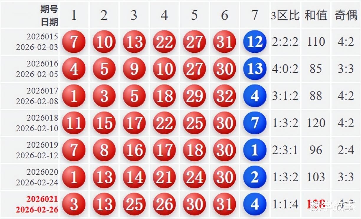 文末有双色球红球3-26-31, 13-25-30的历史统计。【福彩双色球26021期开奖结果及统计】红球号组合历史上有1期四球相同,蓝球4,6注一等奖,奖池26.82亿(2682273374)。双色球26021期开奖结果及中奖情况:出奖时间: 2026-02-26 星期四 红球: 3-13-25-26-30-31蓝球: 4双色球红球重号叠码:13, 30红球隔期下落:30红球奇偶比:4:2红球和值:128红球跨度:28 三区比:1:1:4连号: 25-26, 30-31