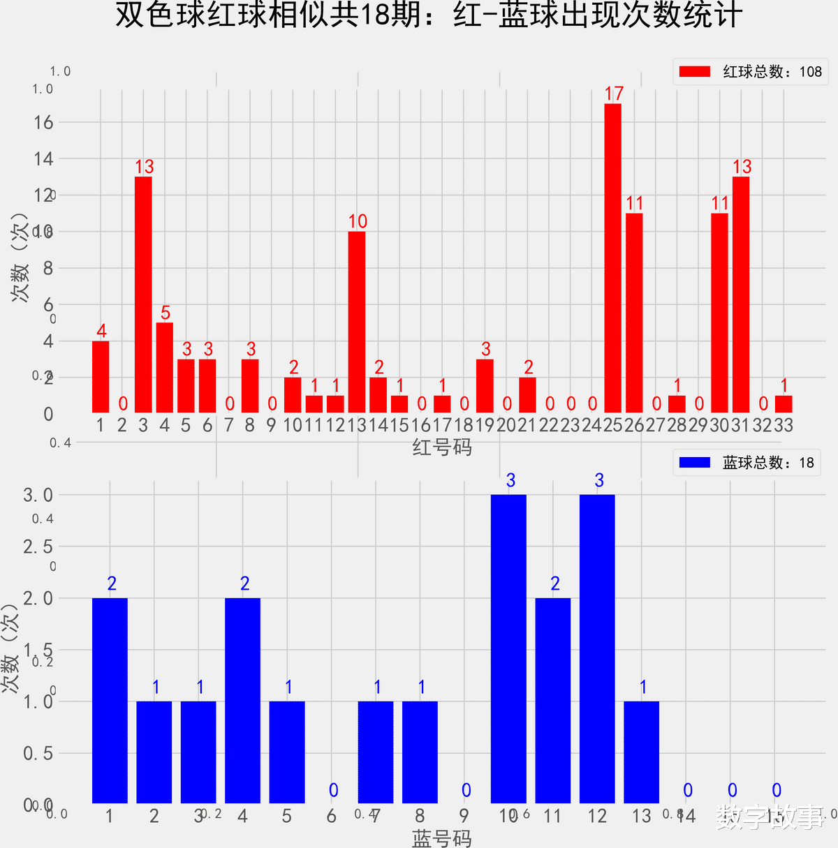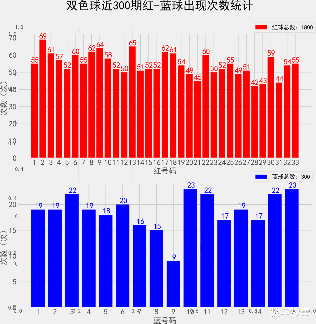 双色球近300期红蓝号统计情况统计样本数据: 1800个红球 300个蓝球