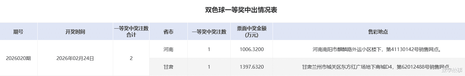 双色球26020期一等奖中奖详情