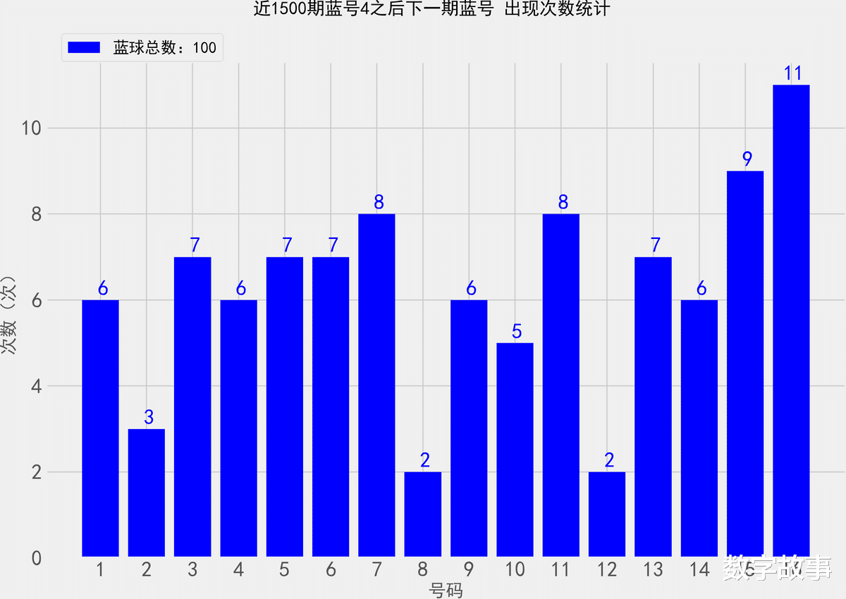 统计近1500期蓝号4之后, 各蓝球的出现次数双色球26021期蓝号是4找出近1500期蓝球4号之后, 下一期出现的所有蓝号,统计其出现次数。,除开这一期,总共出现了100次4号球那么统计的样本数据是100个