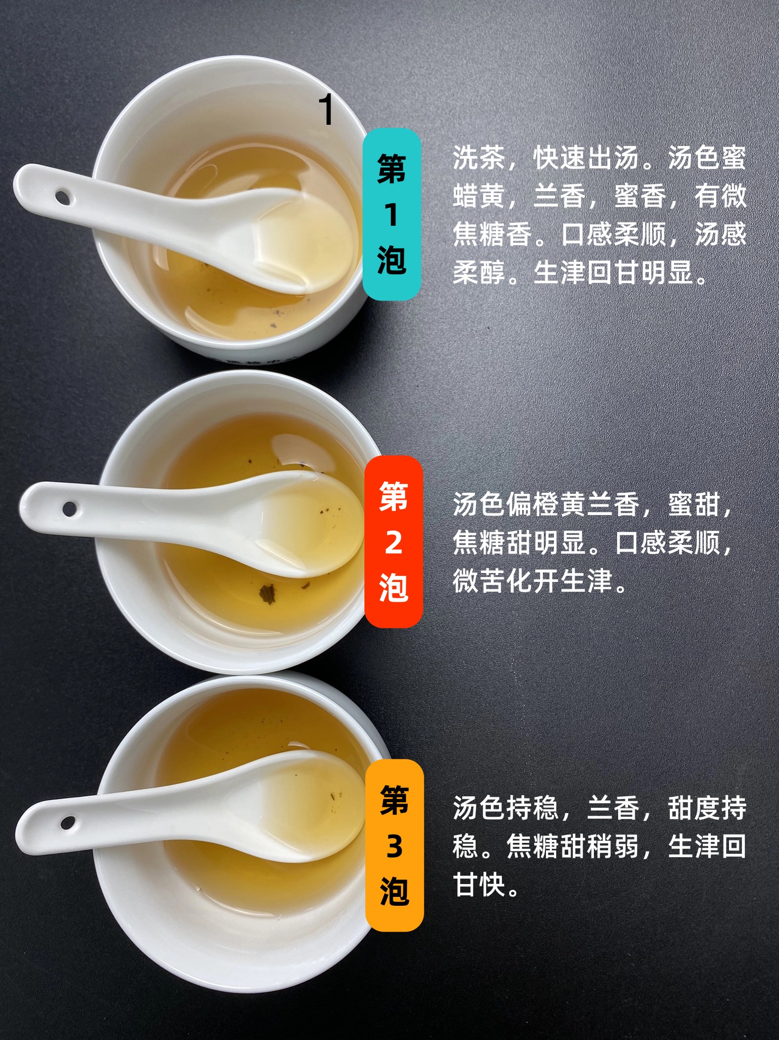 第二泡,汤色偏橙黄兰香,蜜甜,焦糖甜明显。口感柔顺,微苦化开生津。