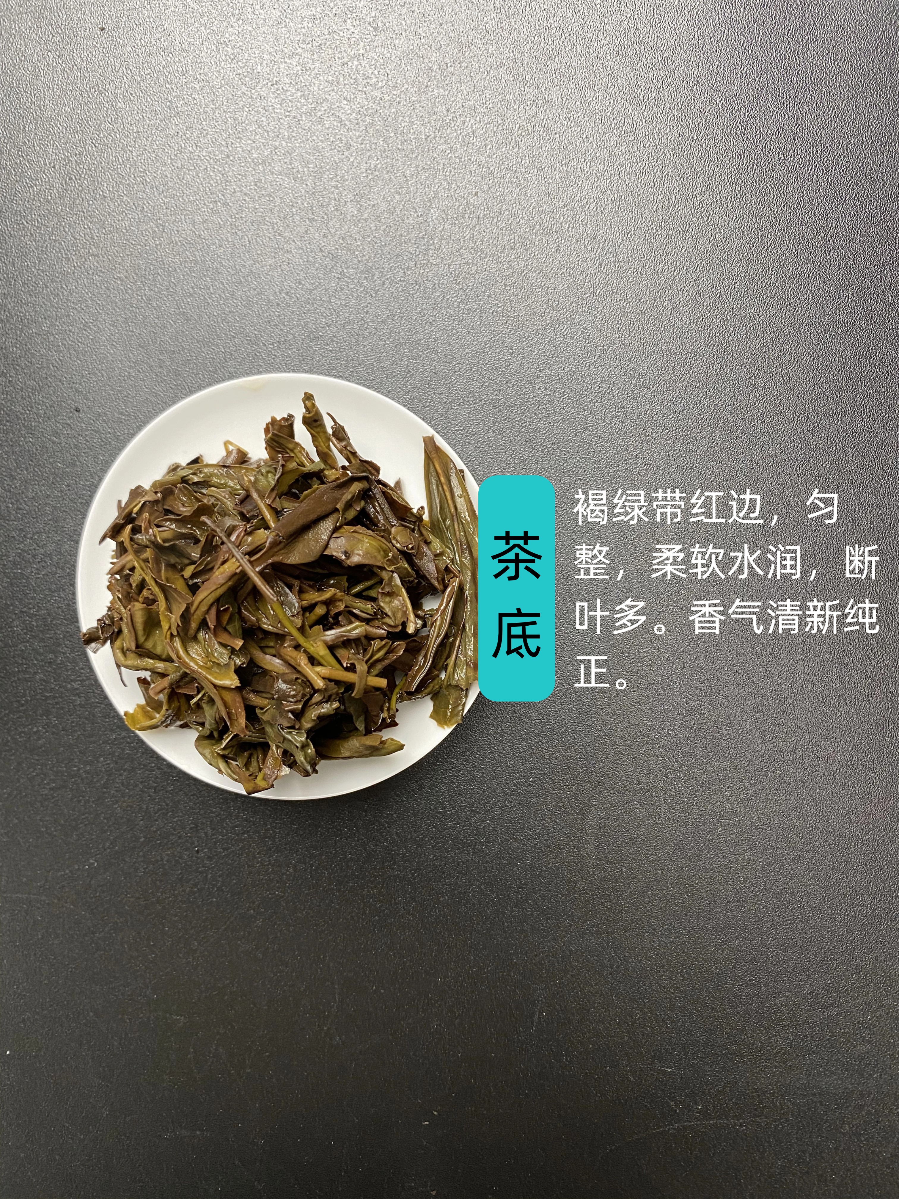 叶底, 褐绿带红边,匀整,柔软水润,断叶多。香气清新纯正。