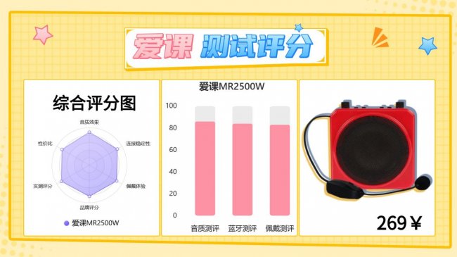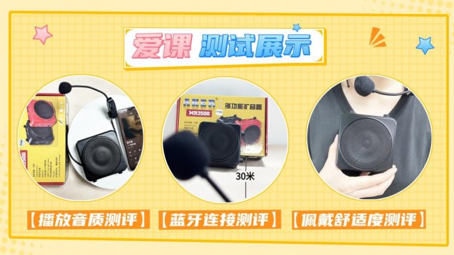 测试机型2、爱课MR2500W【播放音质测评】配备高灵敏海绵降噪咪芯,实际测试中,中音表现稳定,人声还原清晰,能满足日常授课的扩音需求;低音表现相对单薄,缺乏厚重感;高音输出较为明亮,无明显刺耳感。整体音质中规中矩,无明显杂音,日常上课、带早读等基础场景使用完全没有问题。
