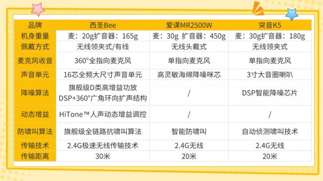 在正式展开三款小蜜蜂扩音器的实测对比前,我先把西圣Bee、爱课MR2500W、突音K5的核心参数整理成表格,方便大家直观对比,快速看清它们在关键配置上的差异与适配场景。