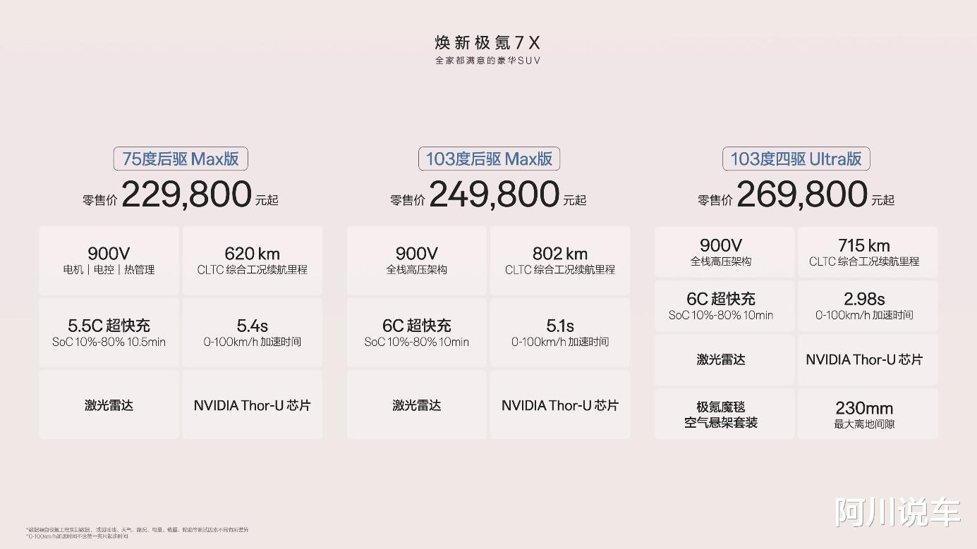 10月28日,焕新极氪7X正式上市,新车共推出75度后驱Max版 、103度后驱Max版、103度四驱Ultra版三款配置版型,官方零售价分别为229,800元、249,800元和269,800元,超级置换权益后限时售价219,800元起。