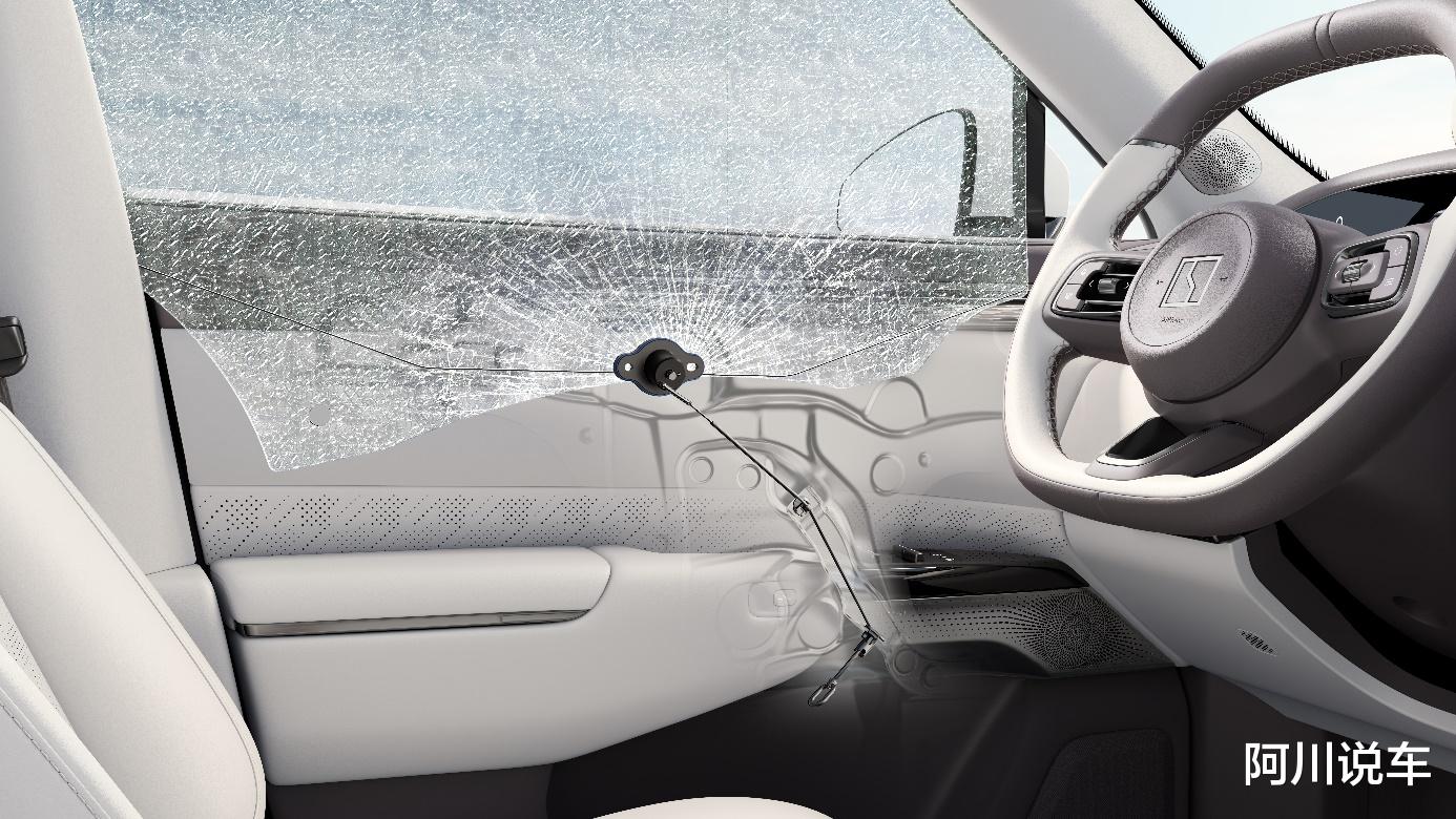 值得一提的是,区别于普通双层夹胶玻璃,焕新极氪7X采用外层3.5mm钢化玻璃+0.76mmPVB胶膜+ 内层1.1mm钢化玻璃的设计,表层压应力和内部张应力形成力学平衡,主驾安全破窗器可以轻松击穿。