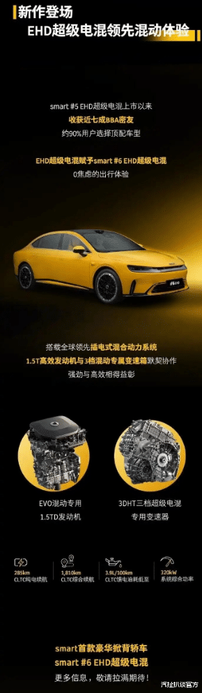 12月6日,smart宣布精灵6号亮相工信部公告,为其首款中型轿车,搭载插电式混合动力系统,全系最长轴距2926mm。从公布的信息来看,这款车尺寸很大,可以说是史上最大smart,接近5米的车长直接来到了Model 3与小米SU7的主战场。