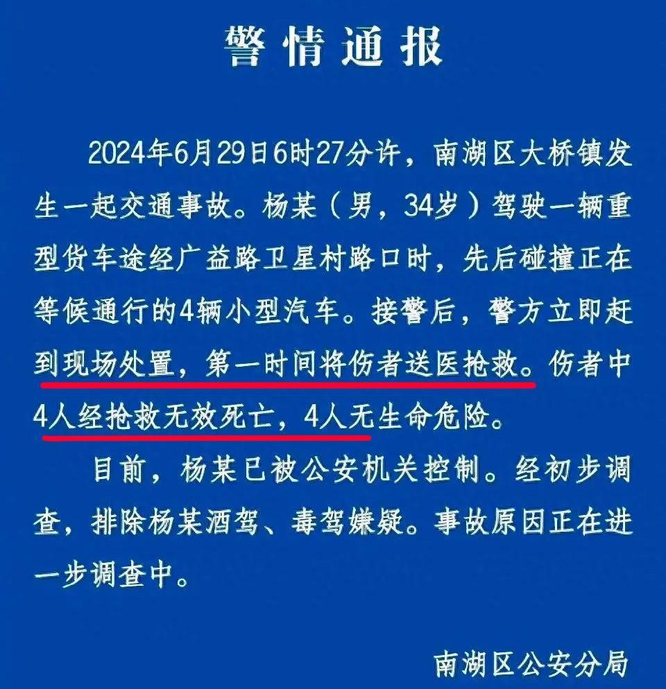 虽然事故发生后,警方立即赶到现场处置,第一时间将伤者送进医院,但还是有4人不幸身亡,另外4人受伤无生命危险,大车司机杨某被警方控制,警方调查后,排除了杨某酒驾和毒驾的嫌疑,具体是什么问题导致的还不确定。