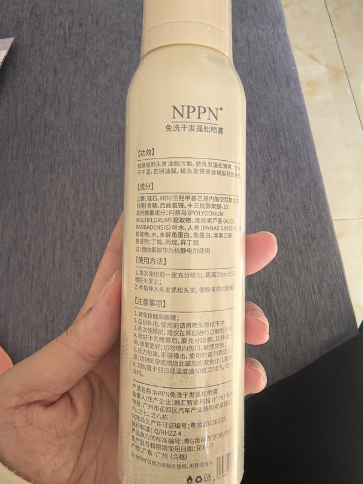 nppn是一个中端洗护品牌,这款干发喷雾定位中端市场,主打清洁控油功效,核心成分是乙醇,能喷出细微的吸附因子,侧重头发清洁,适合所有发质日常基础清洁。它的定价83,容量150ml,性价比一般,没有正规检测报告,资质不够完善,核心功效无法满足我们油头、细软塌的快速救急需求,实测下来,控油效果无法满足高频使用需求。