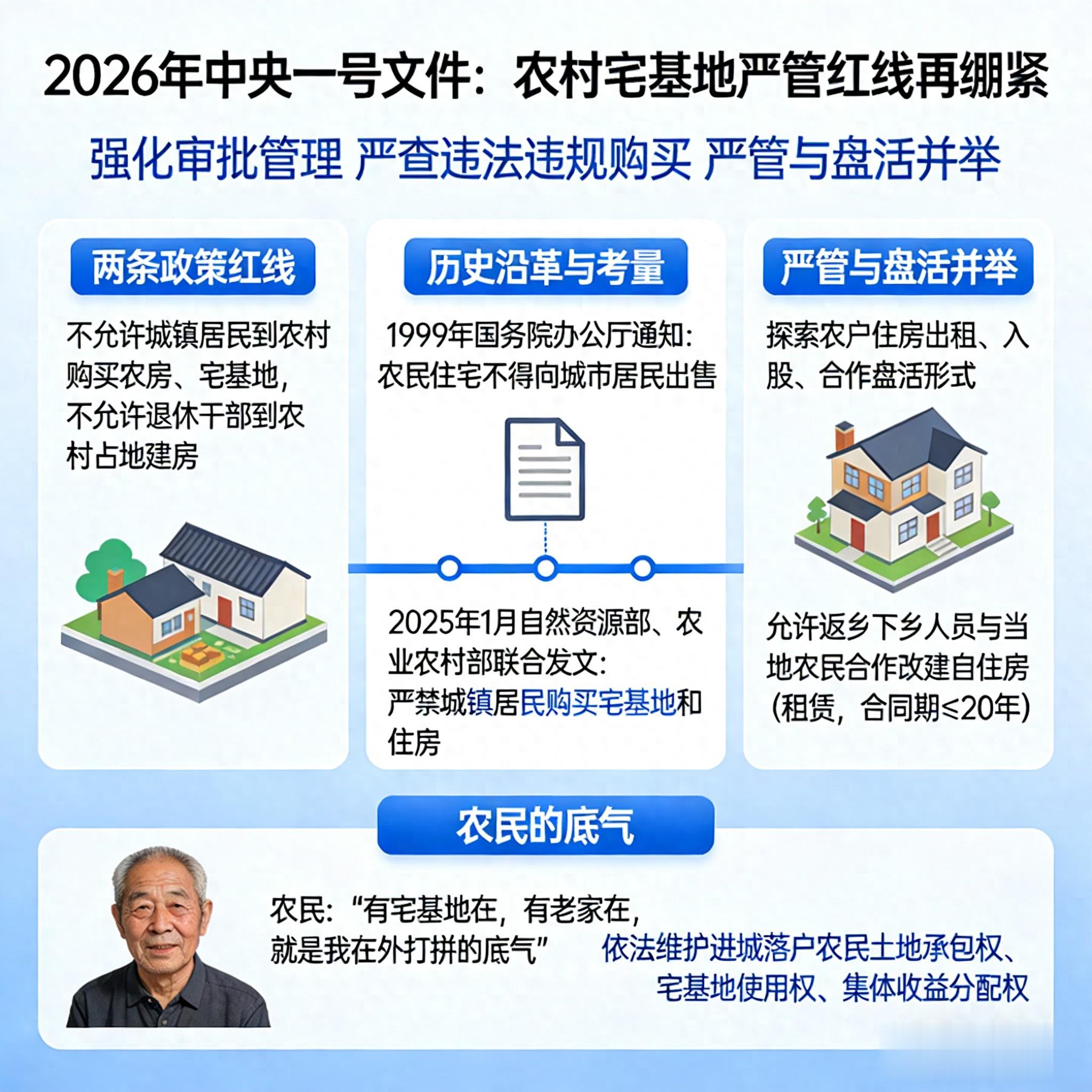 农村宅基地不是“唐僧肉”,严管红线再次绷紧。2026年中央一号文件重申两个“不允许”,为乡村振兴把稳方向。